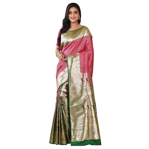 Aishani Collection Woven Patli Pallu Pure Katan Silk Banarasi Wedding Traditional Saree with bp (Pink, Green)