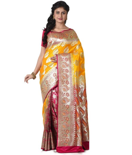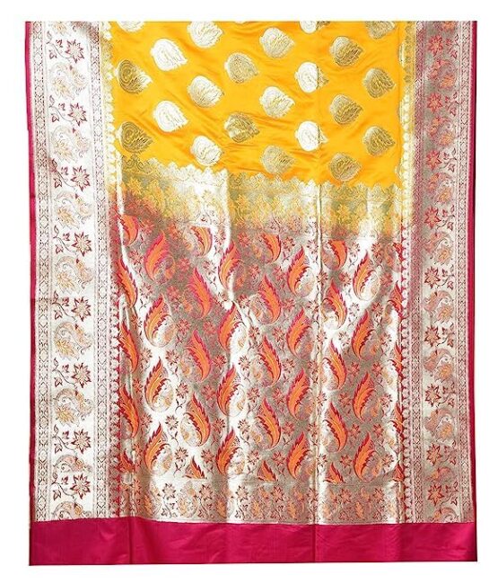 Aishani Collection Pure Katan Silk Wedding Banarasi Women’s Saree with bp (Yellow,Pink)