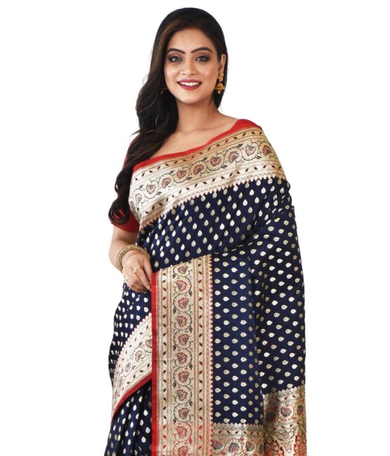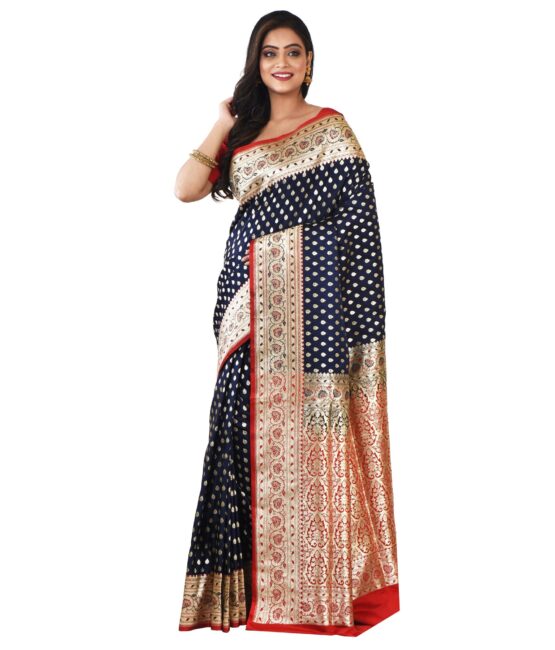 Aishani Collection Woven Buta Work Pure Katan Silk Wedding Banarasi Saree with bp (NavyBlue, Red)