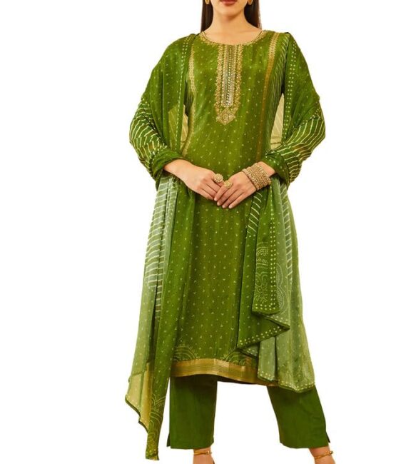 Soch Womens Green Brocade Bandhani Printed Suit Set with Mirror Work