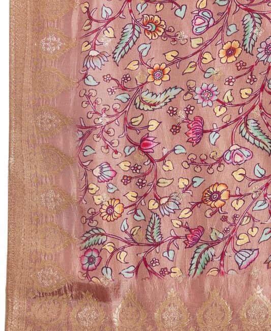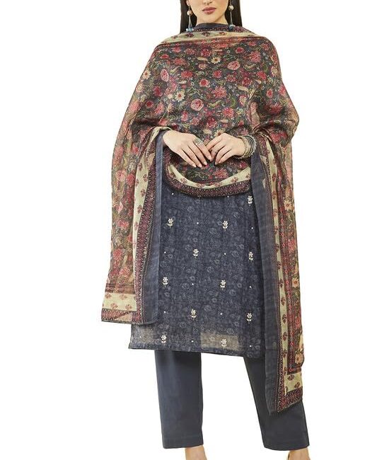 Soch Womens Grey Chanderi Floral Print and Zari Embroidered Suit Set with Dupatta