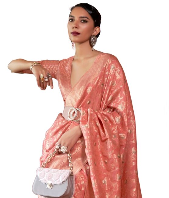 SWORNOF Women’s kanjivaram banarasi silk saree Zari Woven for festival Wedding silk with rich pallu Design sarees for women with Unstitched blouse piece (Peach)