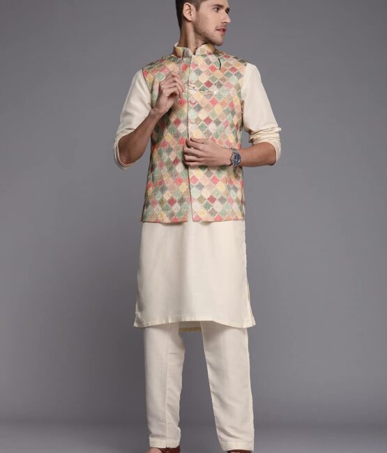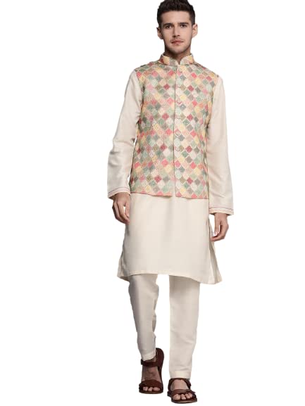 Manyavar Kurta Jacket Set for Men, Full Sleeves Mandarin Collar Ethnic Wear Jacket Set for Festival, Wedding, Party Georgette (Beige, M)