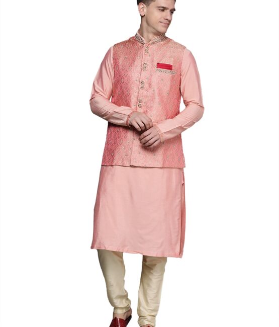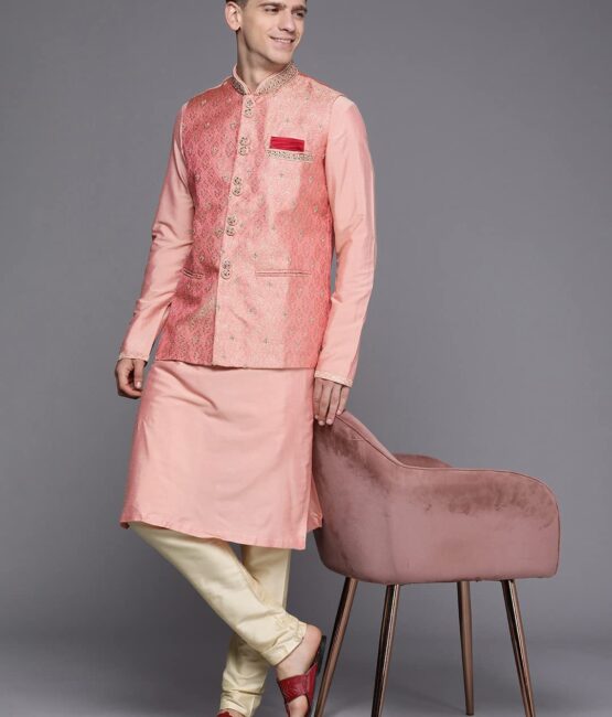 Manyavar Kurta Jacket Set for Men, Full Sleeves Mandarin Collar Ethnic Wear Jacket Set for Anniversary, Wedding, Party Blended Viscose (Peach, M)