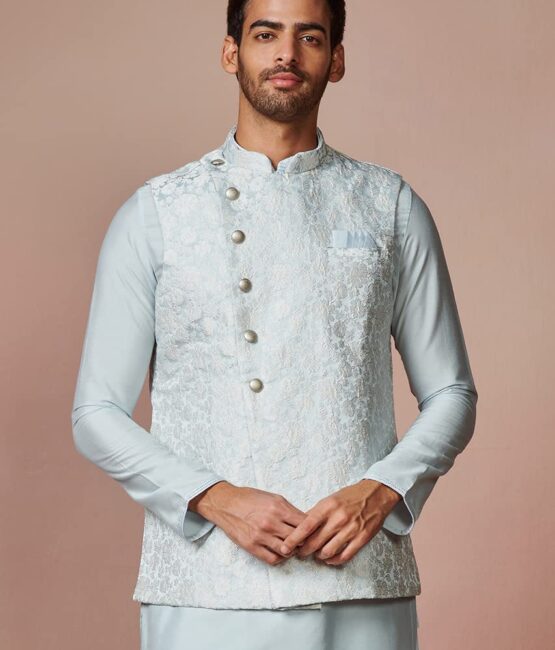 Manyavar Kurta Jacket Set for Men, Full Sleeves Mandarin Collar Ethnic Kurta Jacket Set for Festival, Wedding, Party Art Silk (Blue, S)