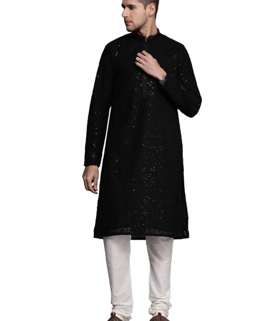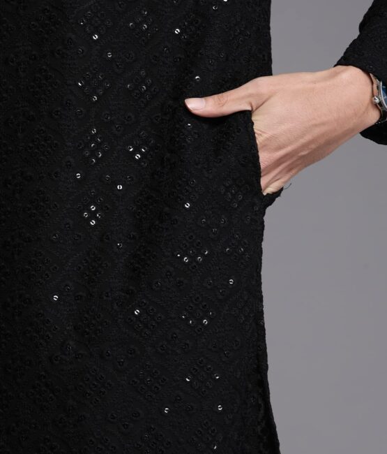 Manyavar Kurta Set for Men, Full Sleeves Mandarin Collar Ethnic Kurta Pajama for Engagement, Wedding, Party All Over Self Design Kurta Set Georgette (Black, M)