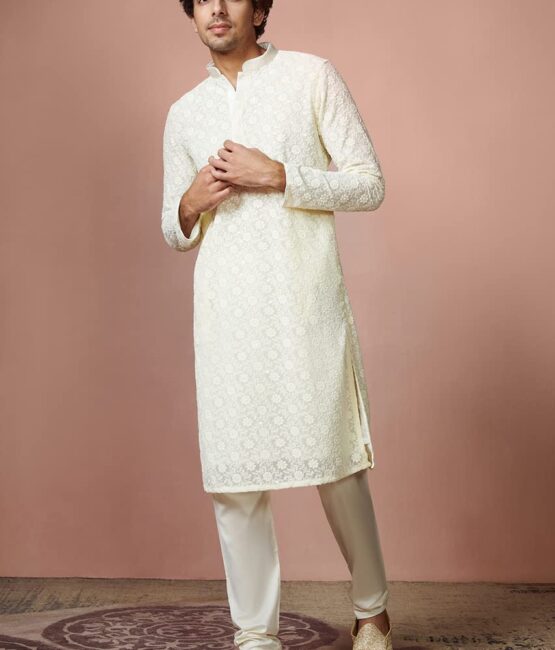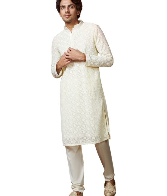 Manyavar Kurta Set for Men, Full Sleeves Mandarin Collar Ethnic Kurta Set For Diwali, Wedding, Party All Over Self Design (Off White, L)