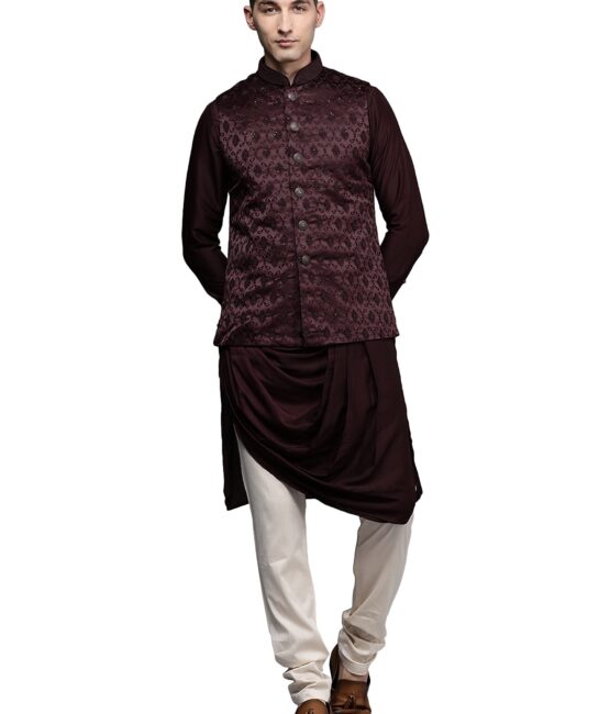 Manyavar Kurta Jacket Set for Men, Full Sleeves Mandarin Collar Ethnic Kurta Jacket Set for Festival, Wedding, Party Art Silk