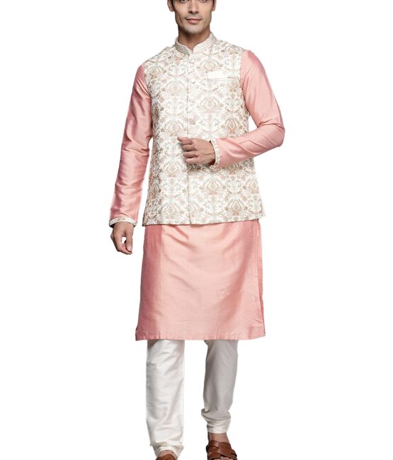 Manyavar Kurta Jacket Set for Men, Full Sleeves Mandarin Collar Ethnic Wear Jacket Set for Festival, Wedding, Party Blended Viscose (Peach, L)
