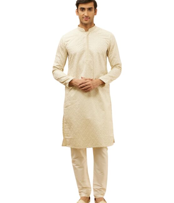 Manyavar Mens Beige Satin Self Design Kurta Pyjama Set