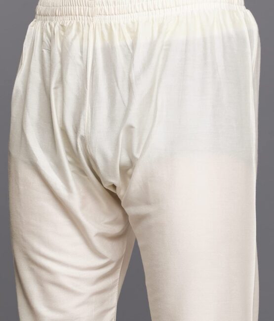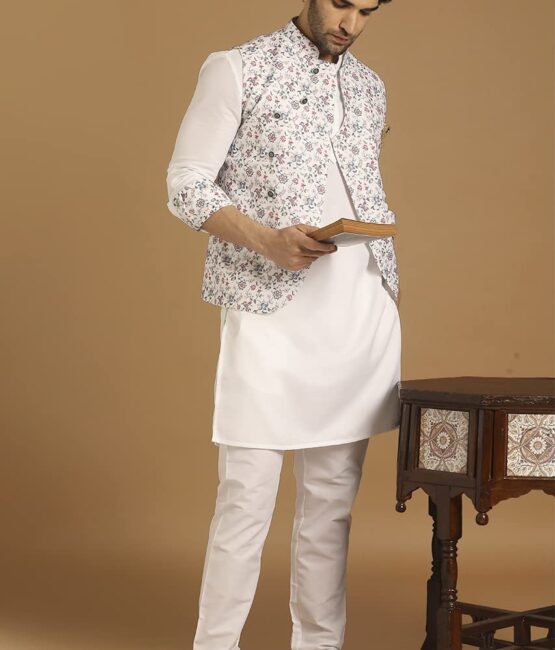 Manyavar Men’s Jacket Kurta Set, Kurta Jacket Set for Men, Full Sleeves Mandarin Collar Ethnic Wear Jacket Set for Festival, Wedding, Party Blended Viscose (White, S)