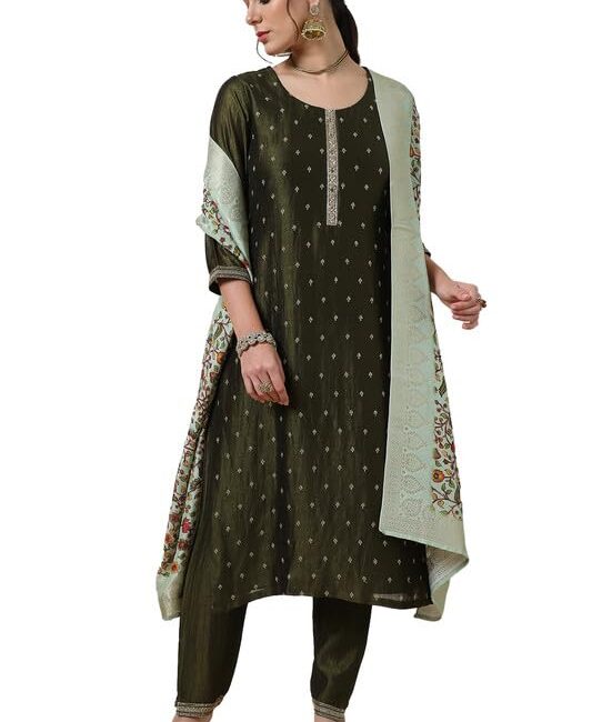 Soch Womens Olive Zari Embroidered Silk Blend Suit Set with Zardosi