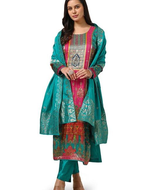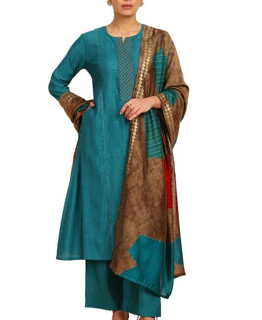 Soch Womens Teal Brocade Ethnic Motifs Suit Set With Faux Mirror And Sequins