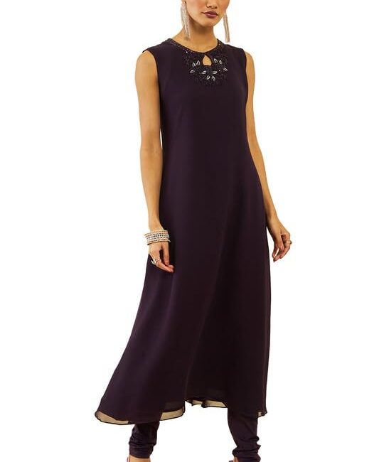 Soch Womens Wine Georgette Beadwork Embellished A-Line Chudidar Suit Set with Shrug