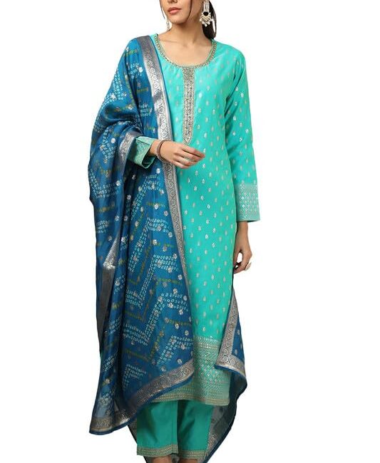 Soch Womens Turquoise Blue Chanderi Embellished Suit Set With Sequins