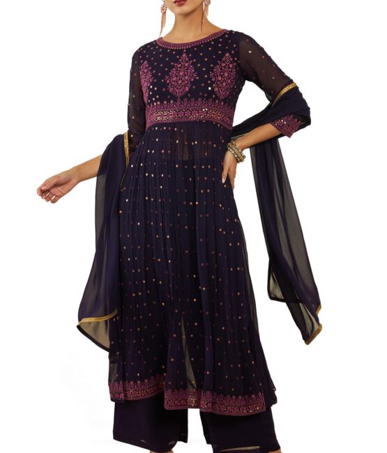 Soch Womens Wine Georgette Suit Set With Embroidery And Sequins