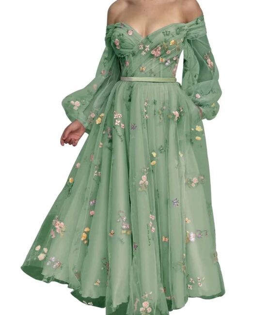 UZN Women’s Puffy Sleeve Tulle Prom Dresses Tea Length Pink Flower Lace Formal Evening Gowns, Green, 6