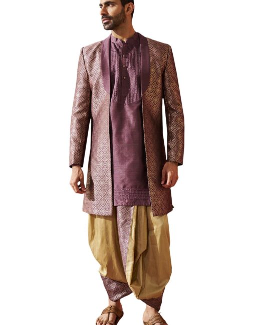 VASTRAMAY Men’s Purple Silk Blend Sherwani Set, Silk Blend Jacquard Indo Western, Kurta And Dhoti Set for Men for Weddings & Festivals, Traditional Ethnic Wear Outfit