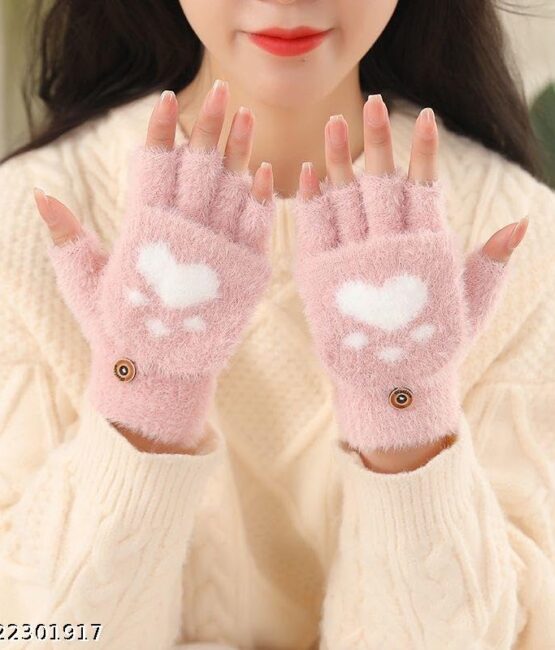 Women Woolen Gloves Half Finger Acrylic Angora Wool Knitted Plush Winter Mitten Gloves for Girls and Boys Casual Warm Fingerless Hand Gloves Free Size Peach