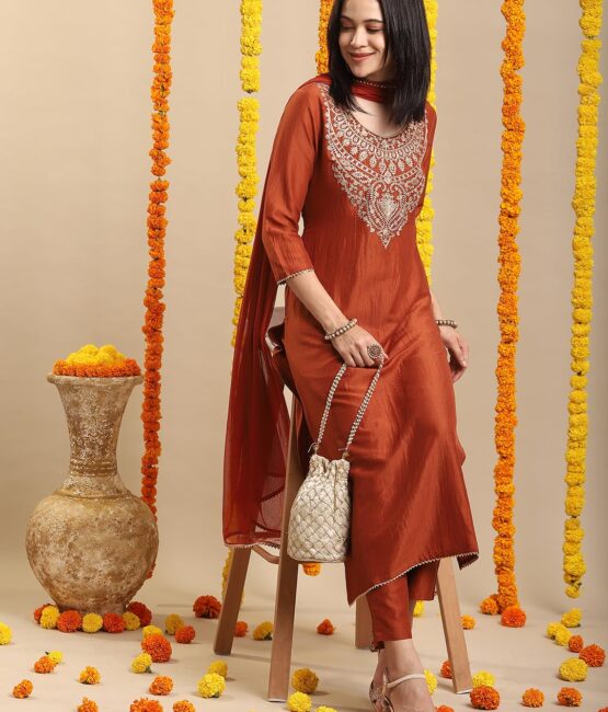 GoSriKi Women’s Rayon Blend Straight Embroidered Kurta with Pant & Dupatta (GALPATIYO Mustard-GS_M_Mustard_Medium)