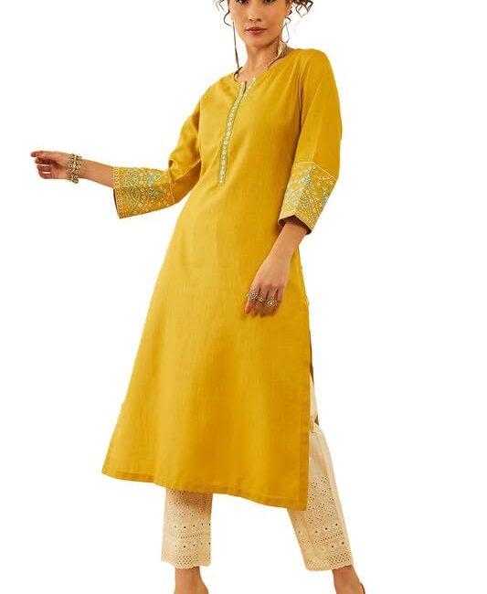 Soch Womens Mustard Silk Blend Embroidered Kurta Set with Thread Work