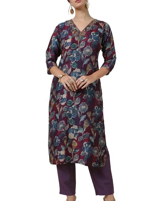 Soch Womens Maroon Botanical Print Muslin Blend Kurta Set with Sequins