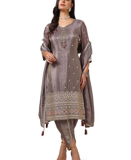 Soch Womens Grey Tissue Suit Set With Stones And Sequins