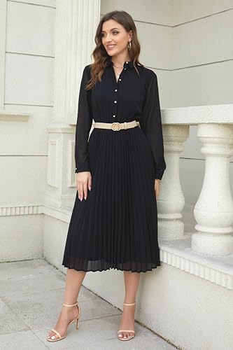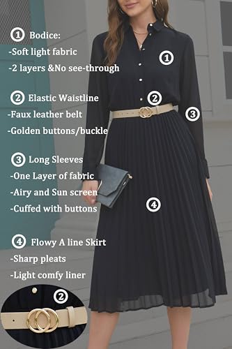 - Elegant Design: Womens long modest dress with flowy pleated hem, button closure and turn down collar at the top, long sleeves with cuffs, flattering fit with elastic high waist, plain pastel colors and faux leather belt included