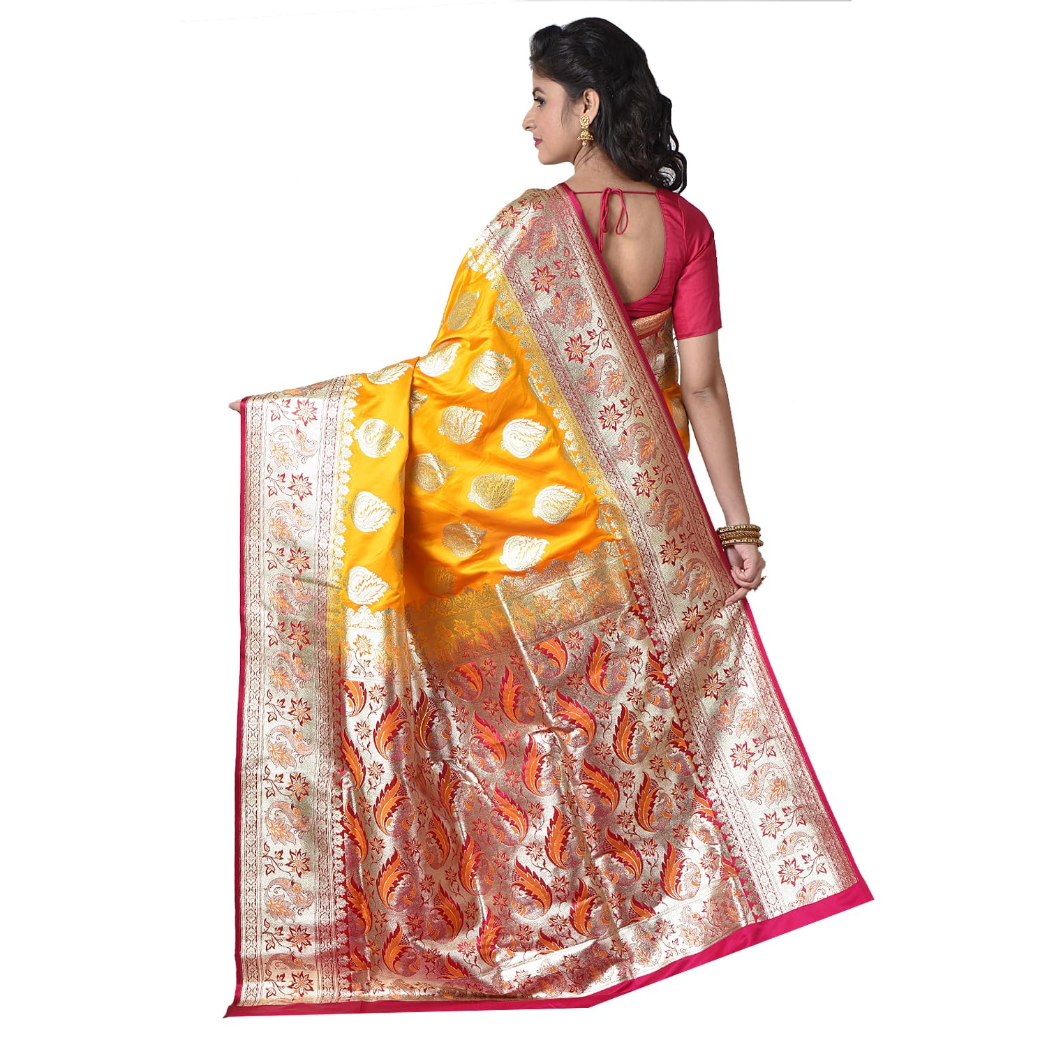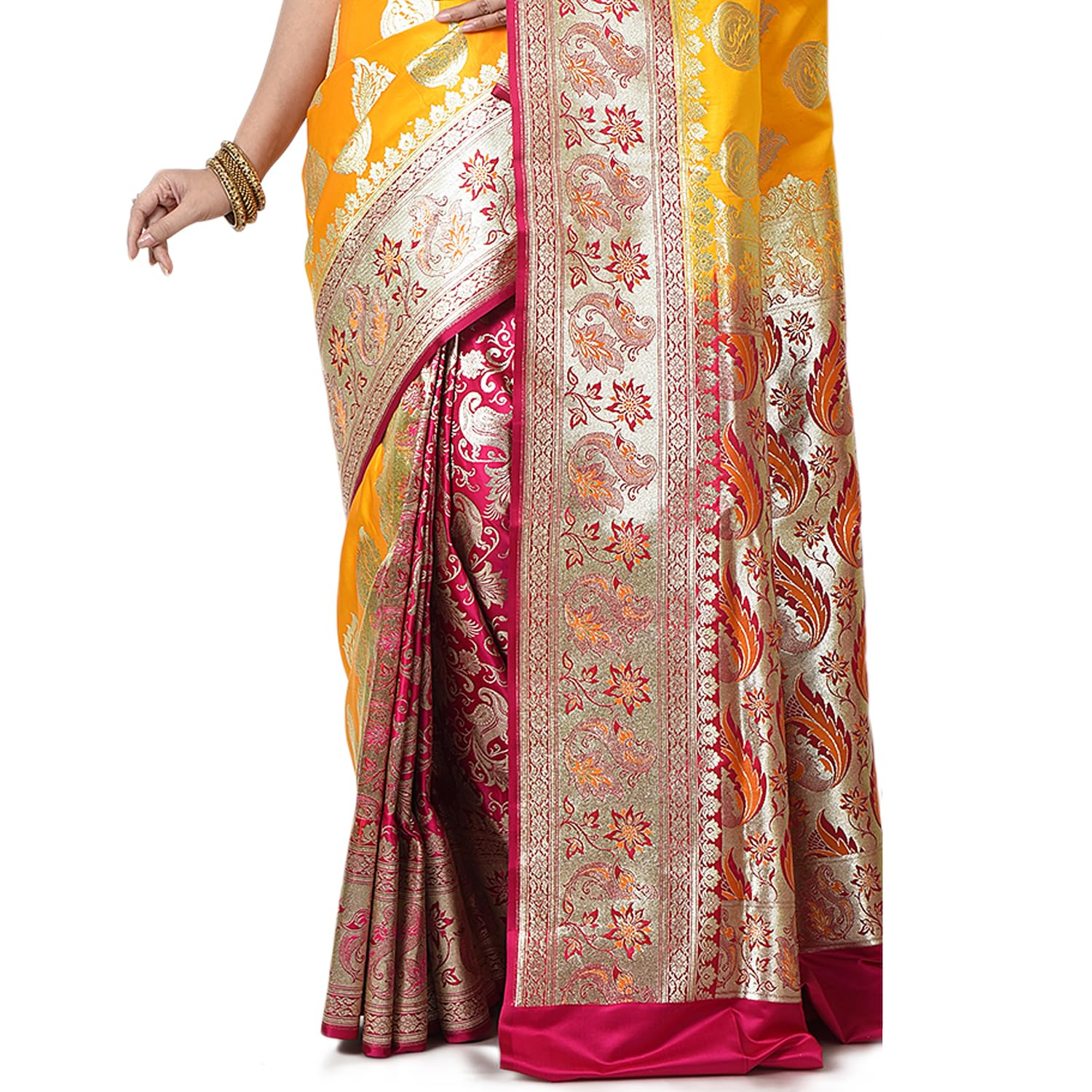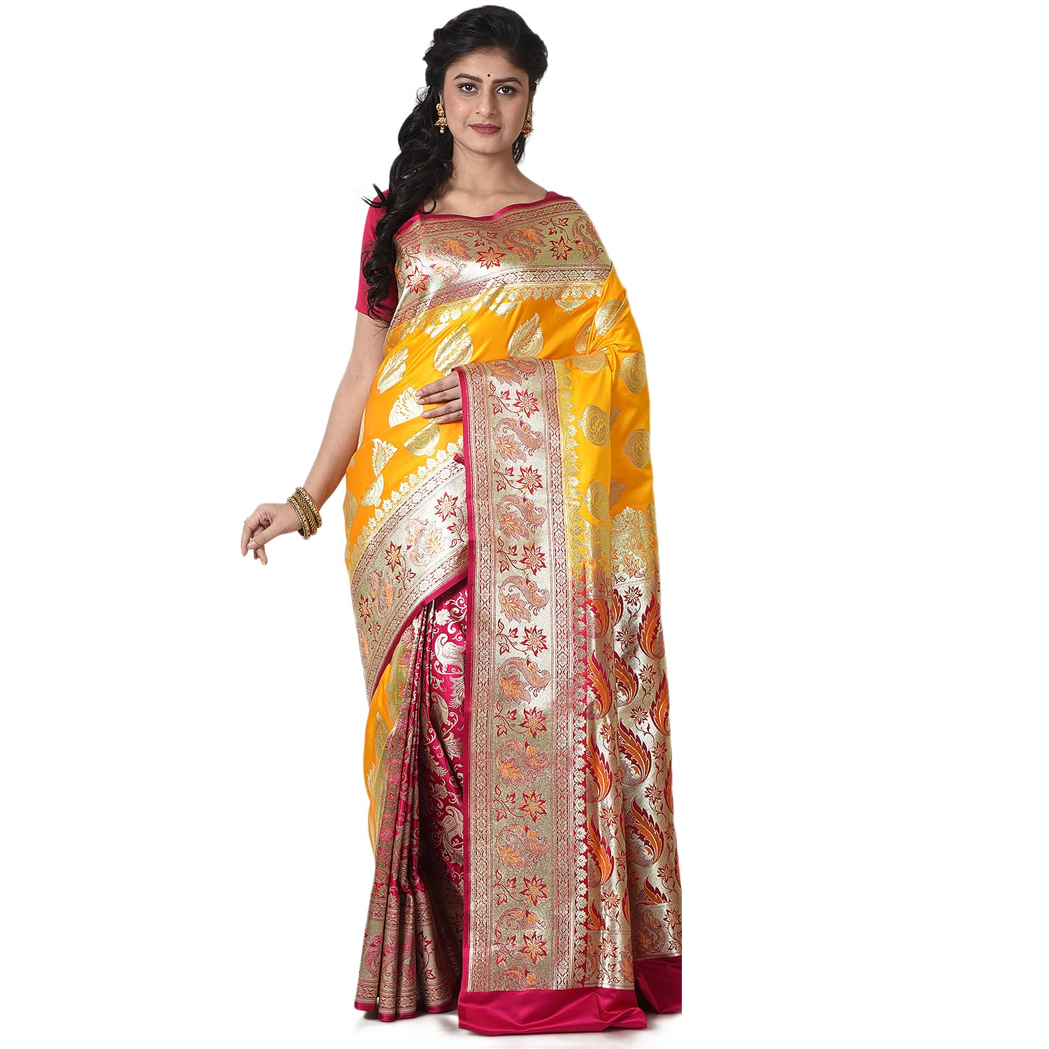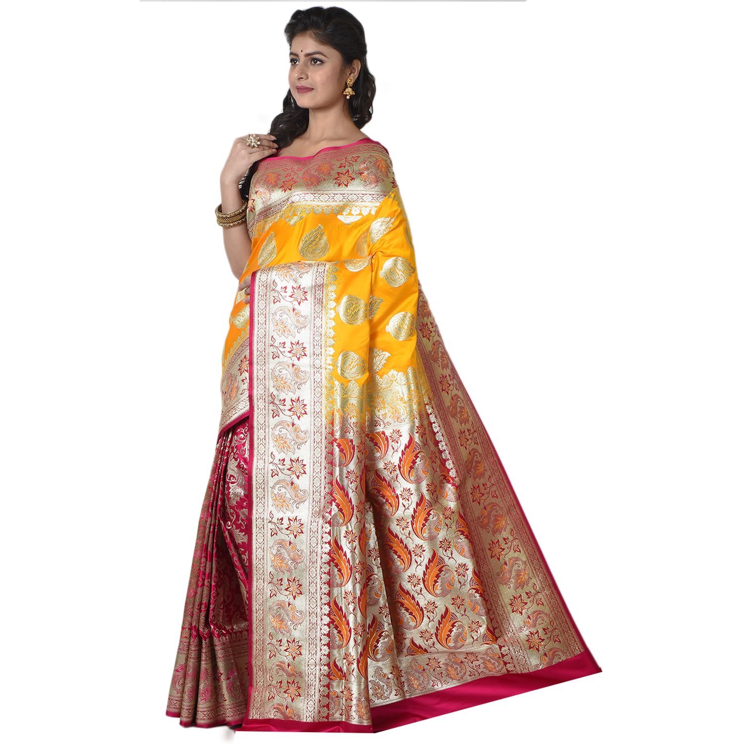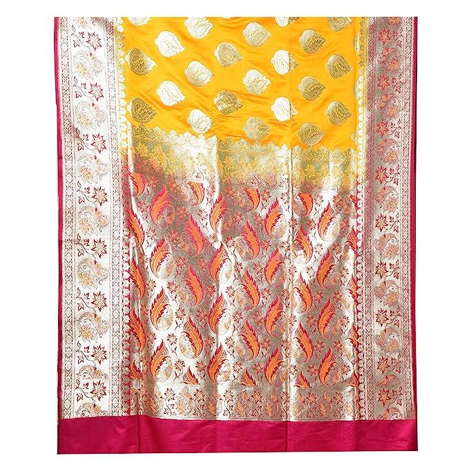 Aishani Collection Pure Katan Silk Wedding Banarasi Women's Saree with bp (Yellow,Pink)