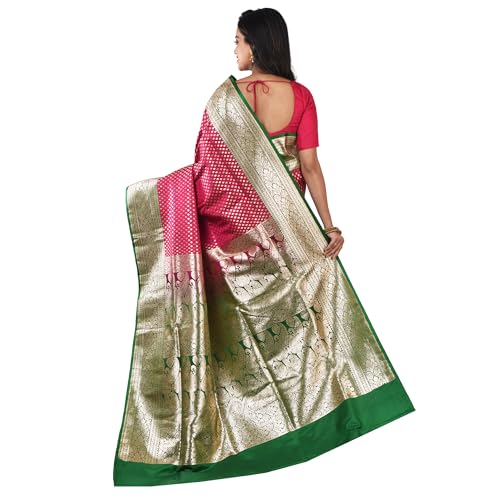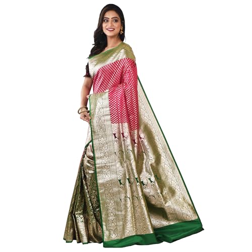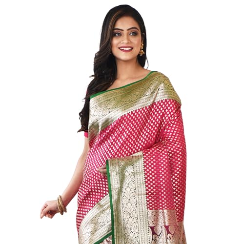 Aishani Collection Woven Patli Pallu Pure Katan Silk Banarasi Wedding Traditional Saree with bp (Pink, Green)