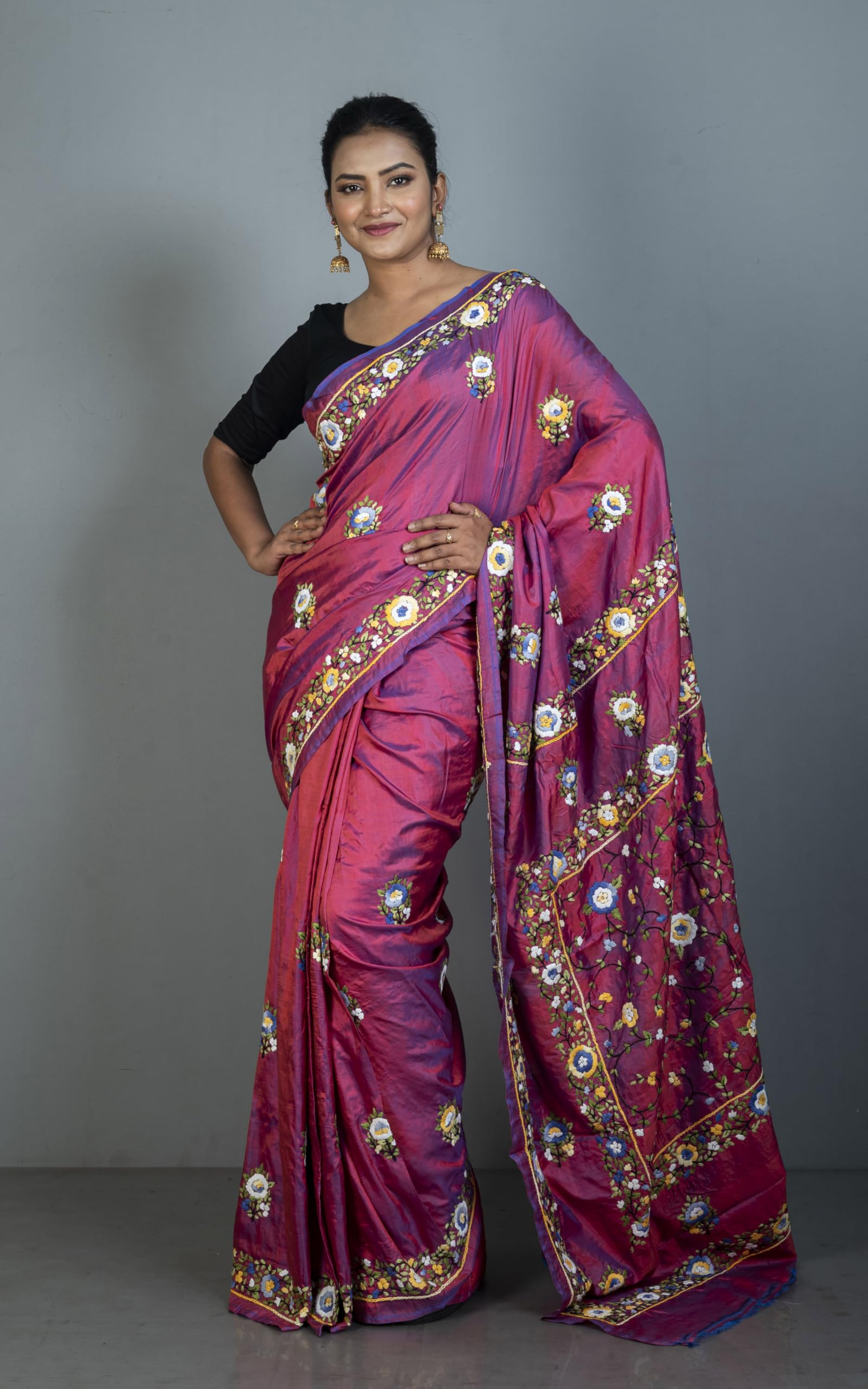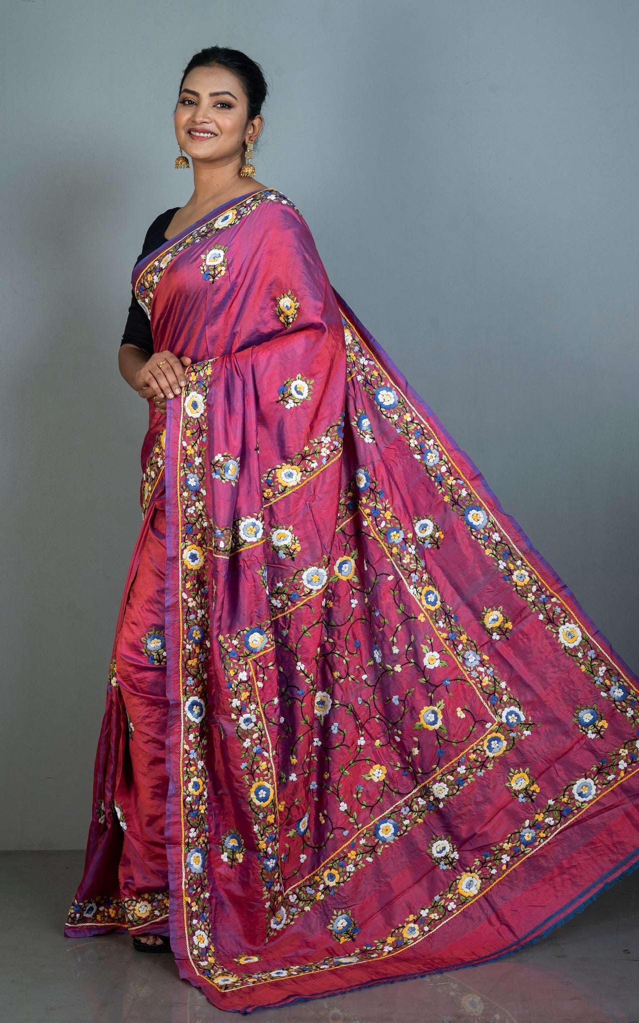 Bengal Looms India – Parsi Hand Work on Soft Bishnupuri Katan Silk Saree in Liseran Purple with Blouse Piece