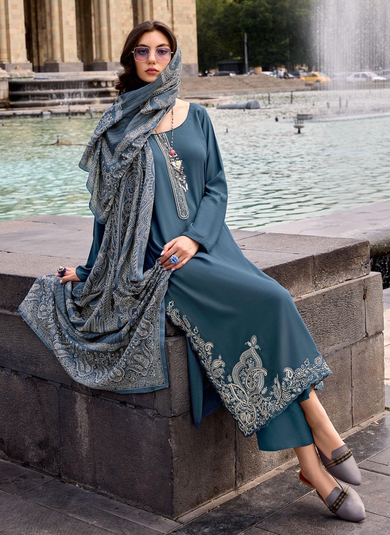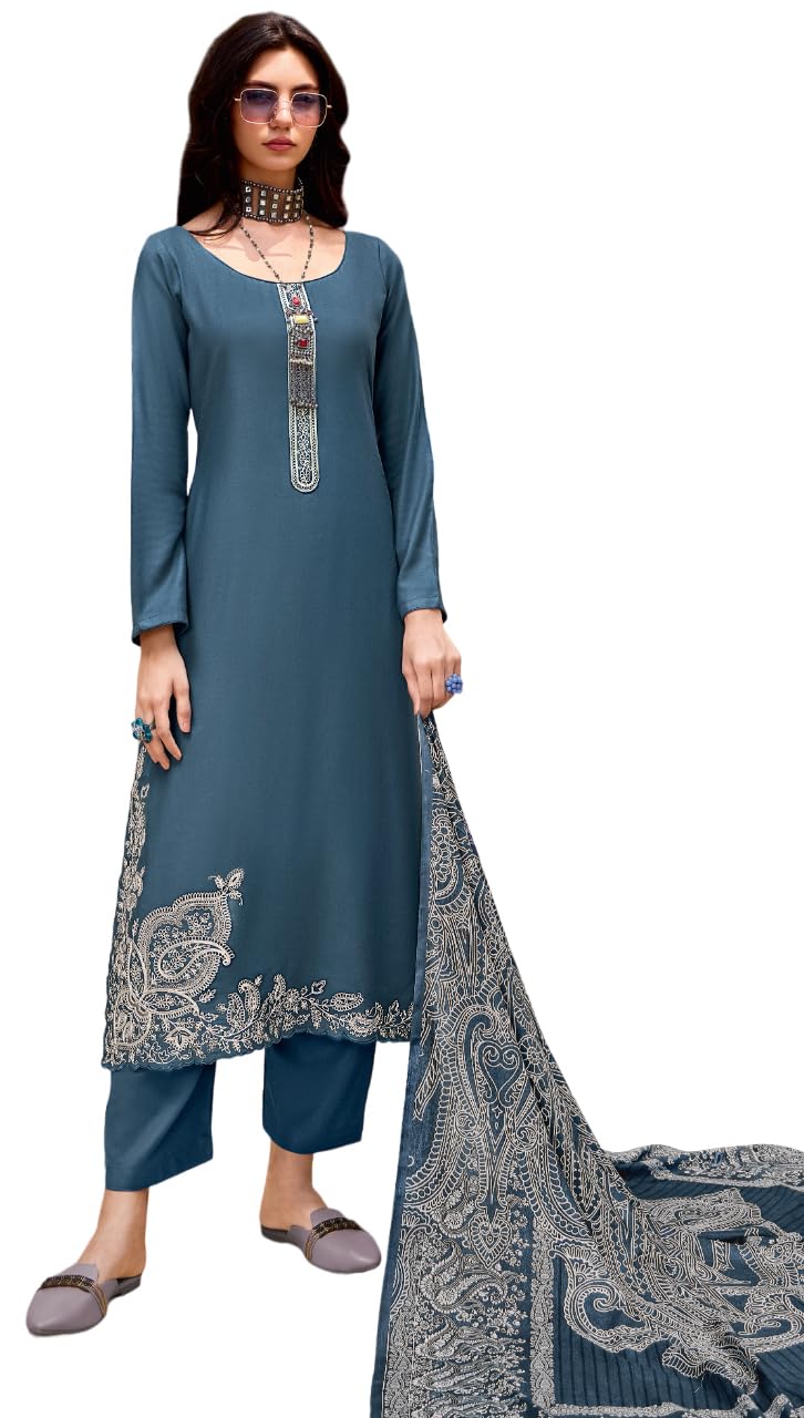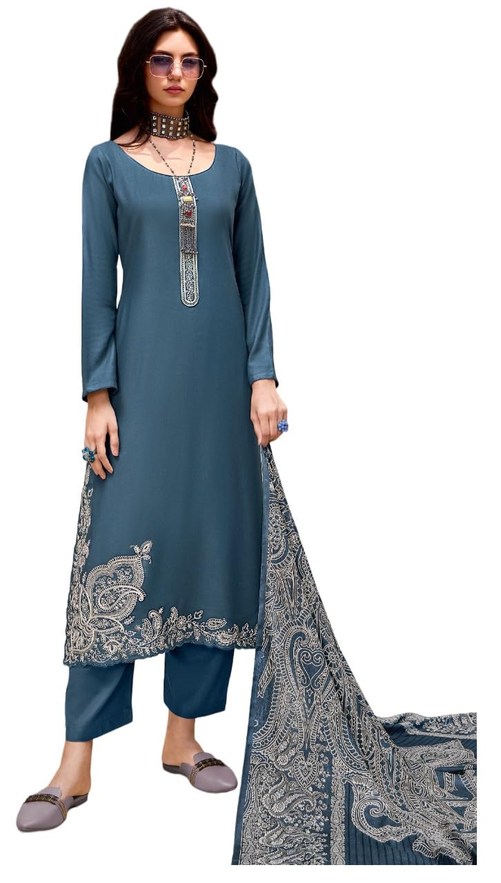 Enhance your ethnic wardrobe with the Dravinam Trends Unstitched Winter Wear Pashmina Salwar Suit Dress Material. This exquisite set features a beautifully embroidered top and bottom made from 100% pure viscose staple, ensuring comfort and breathability for any occasion. The included digital silk and wool shawl adds a luxurious touch, making this ensemble a must-have for fashion enthusiasts.