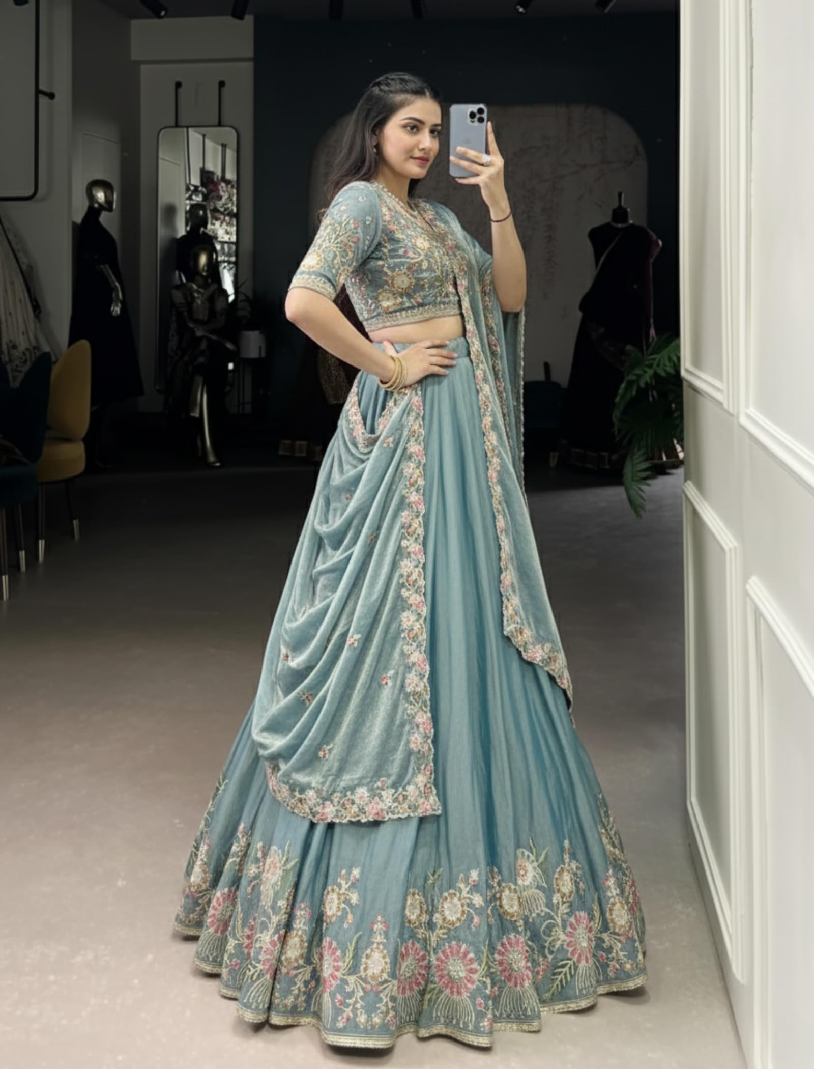 - Lehenga (Stitched), Lehenga Fabric : Zari Shimmer, Lehenga work : Sequins and Thread Embroidery Work , Lehenga Waist : Support Up To 42, Lehenga Closer : Drawstring with Zip , Stitching : Stitched With Canvas and Can Can , Length : 41, Flair : 3.50 Meter, Inner : Micro Cotton