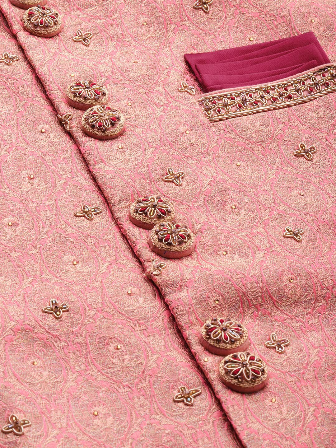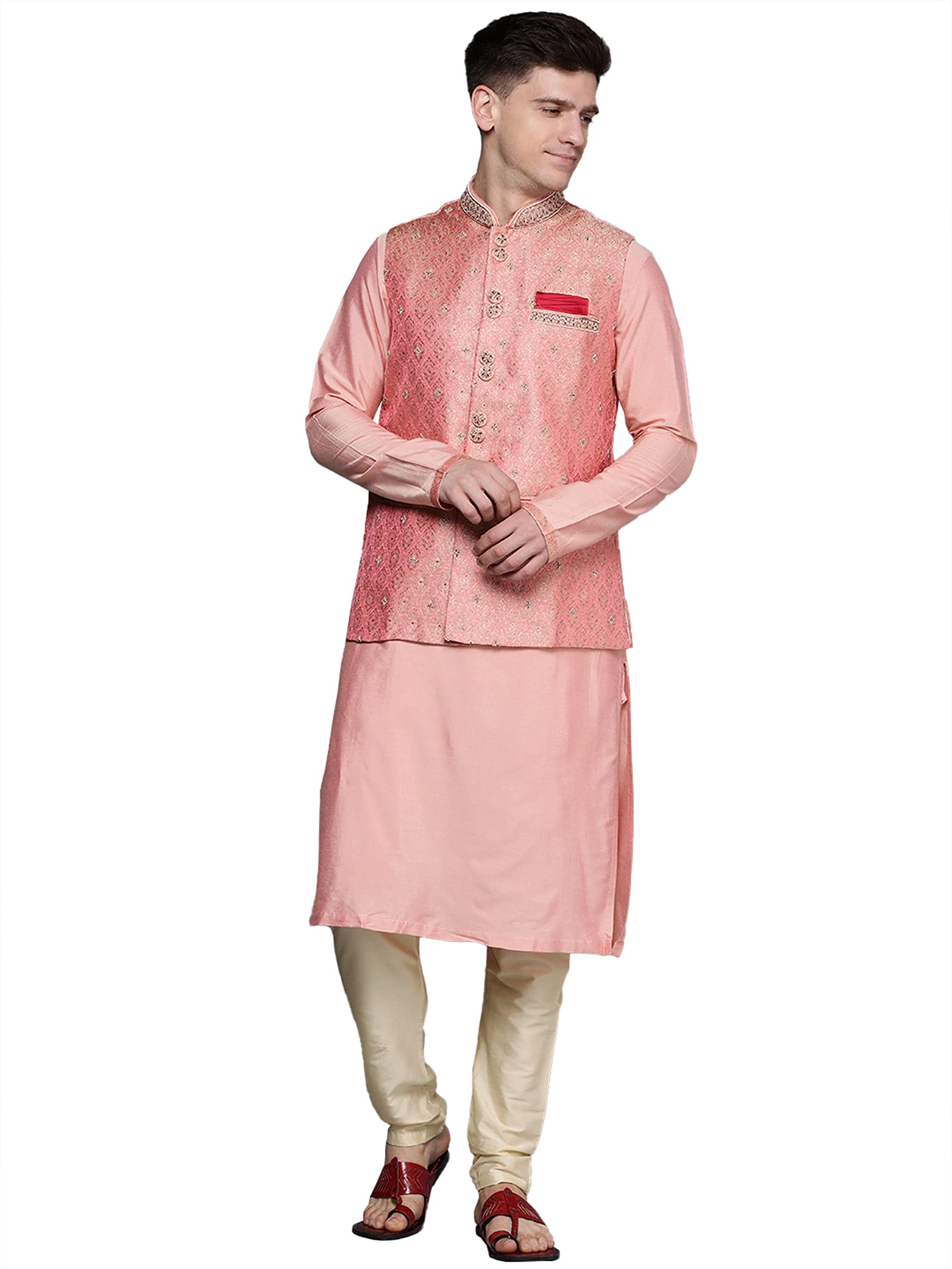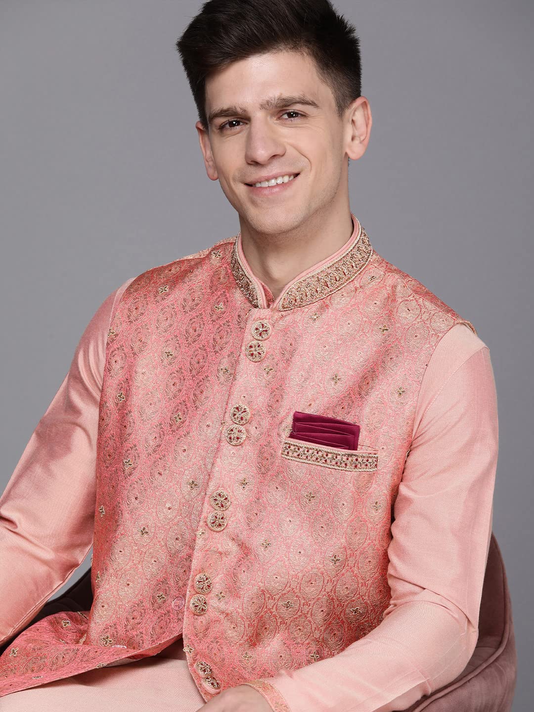 Manyavar BLENDED VISCOSE PEACH All over self design Full Sleeve Jacket Set