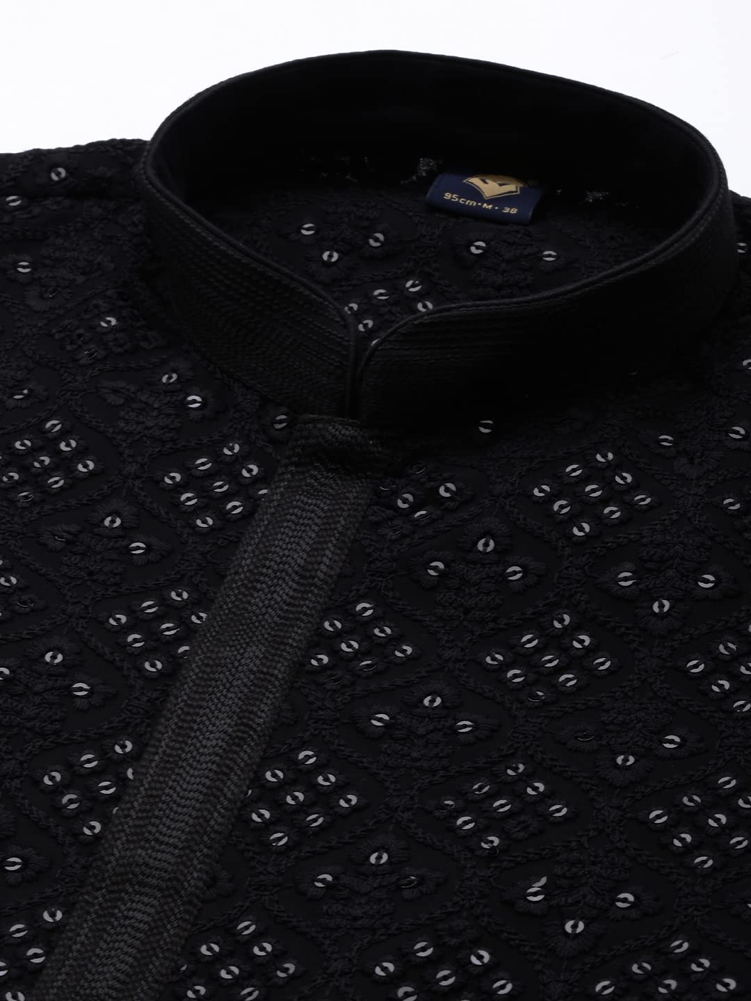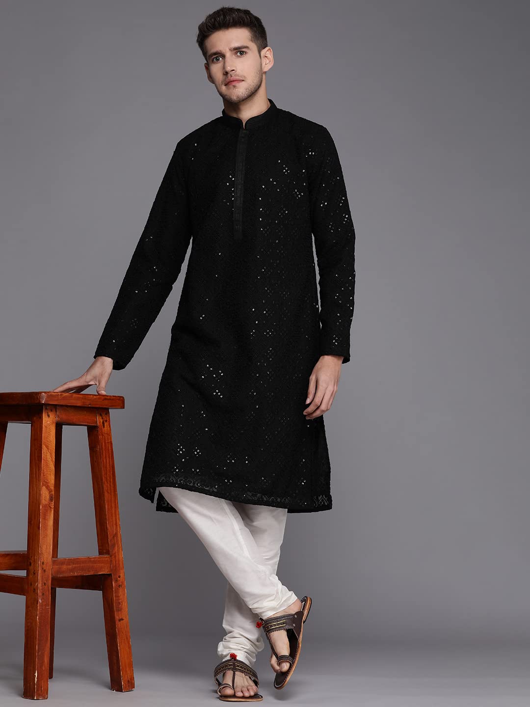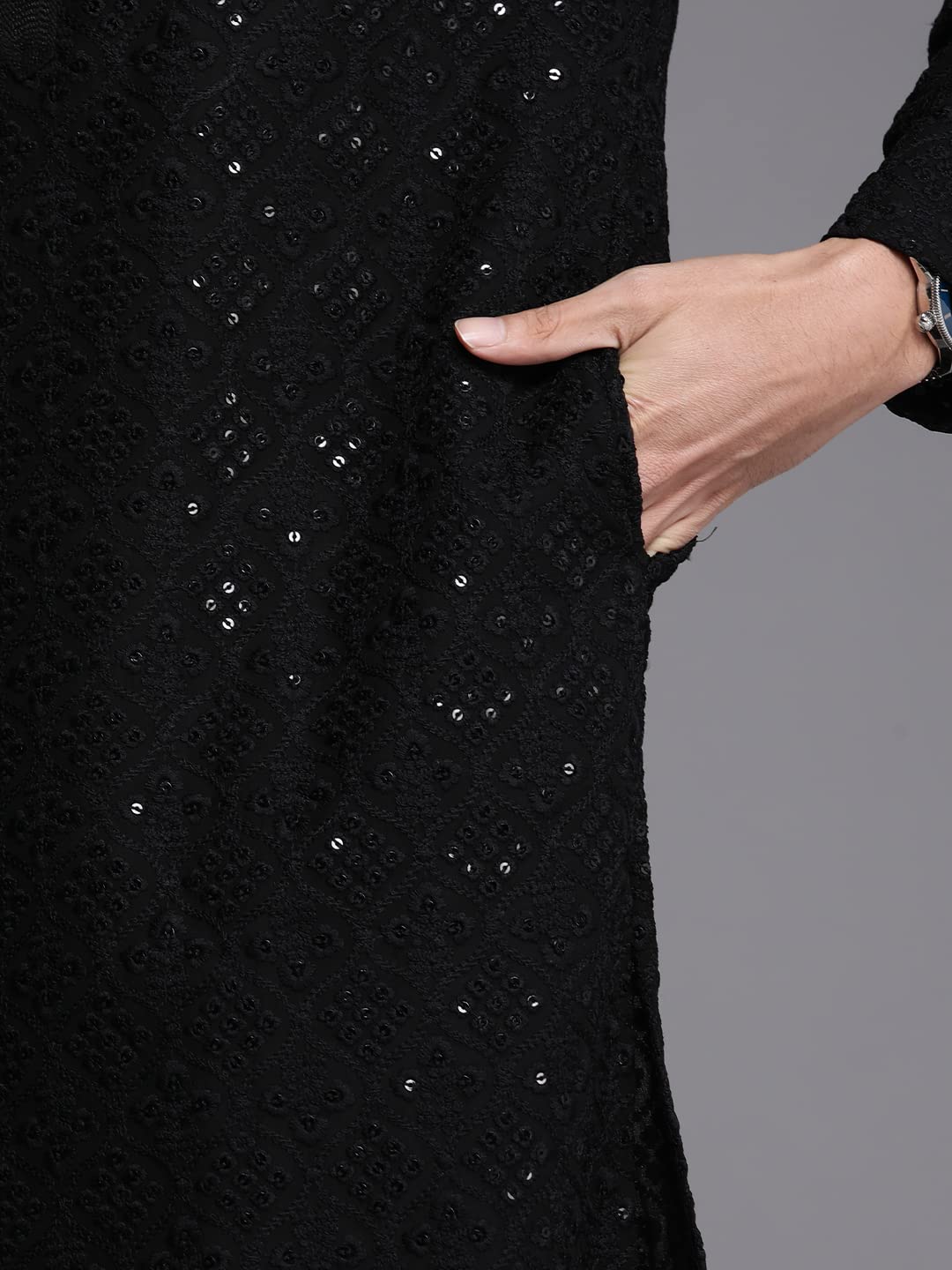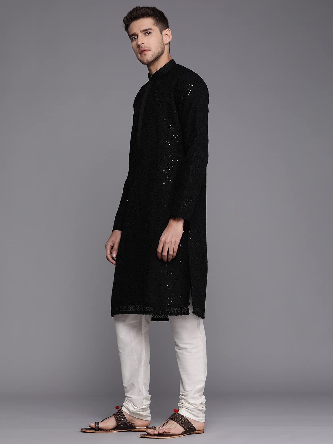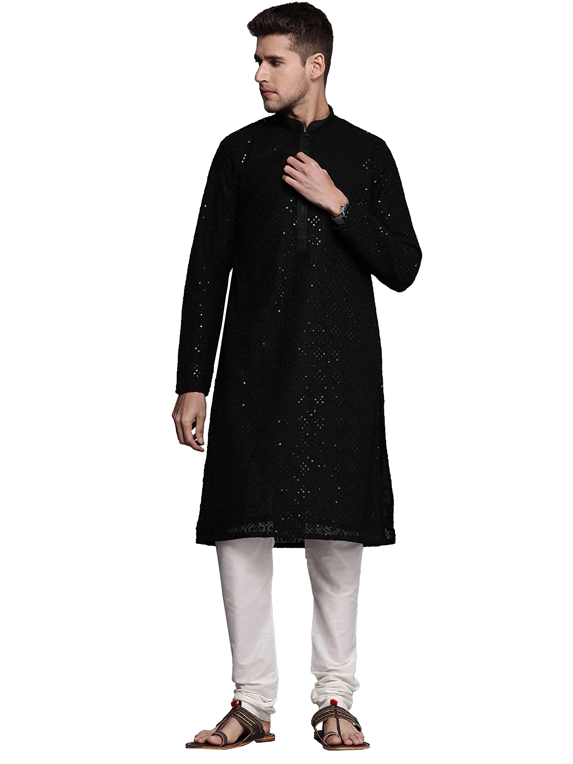 - Walk with elegance in this immaculate black georgette Kurta Pajama, adorned with ornate sequin work and Chikankari embroidery. Perfectly tailored for festival celebrations or as a wedding attendee, this ensemble comes with a stylish Kurta and comfortable Churidar. Embrace your engagement or any special occasion with this exquisite attire.