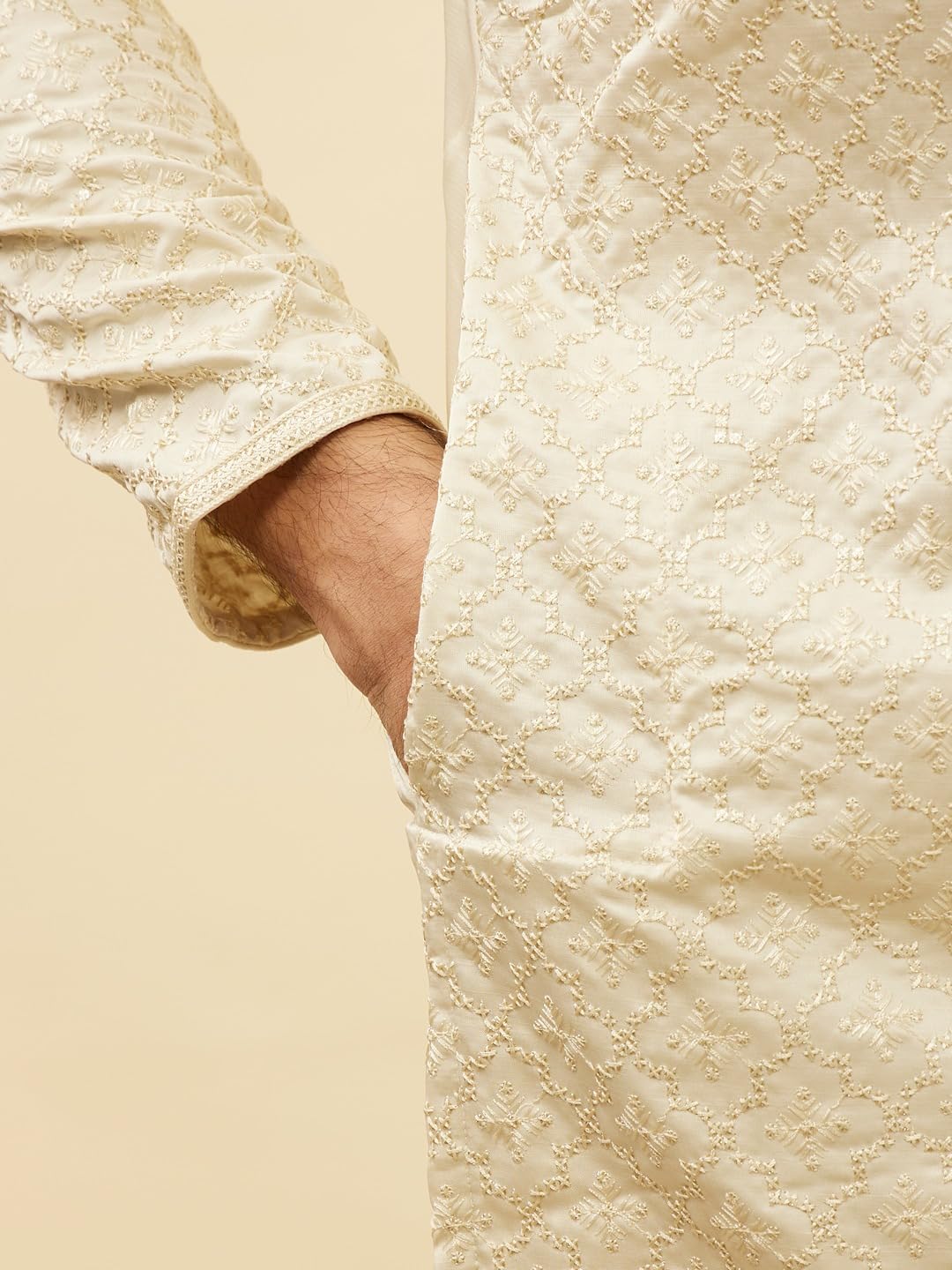 - Design:-Offering a blend of traditional artistry and modern sparkle, this pearl white kurta set showcases exquisite jaal embroidery with sequinned highlights. The kurta’s allure is further elevated by embroidered detailing on the placket and bandhgala collar, making it a symbol of elegance and finesse. Suitable for special celebrations and formal gatherings, this embroidered kurta set can be styled with sleek gold jewellery and golden jutis.