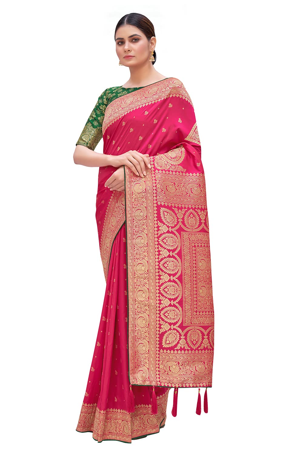 • Product Highlights : Fabric: Banarasi Silk Blend (Saree & Blouse) || Work: Zari Woven (Saree), Zari Woven (Blouse) || Colour: Saree –Pink | Blouse – Green || This Banarasi silk Blend Saree with Subtle Zari Work.