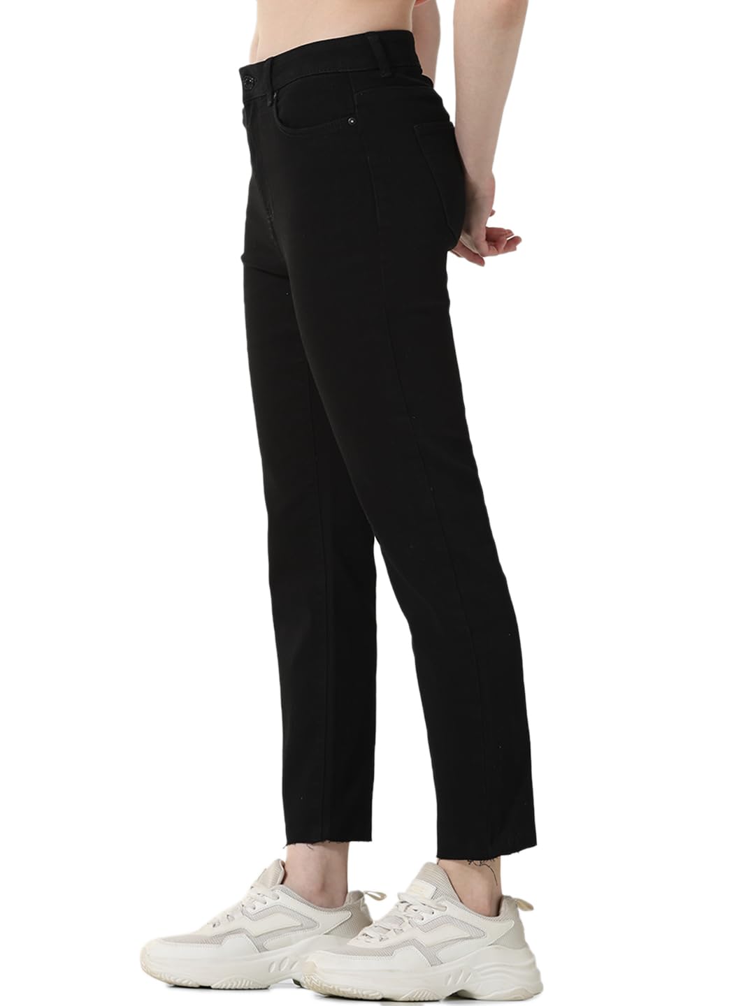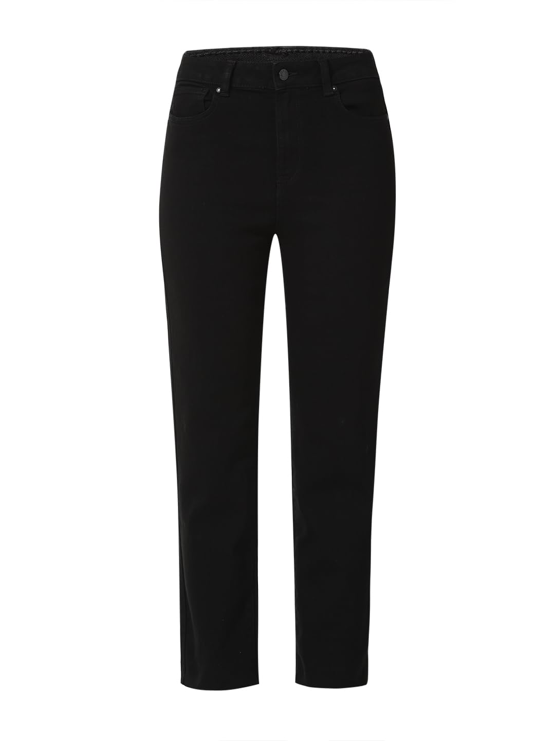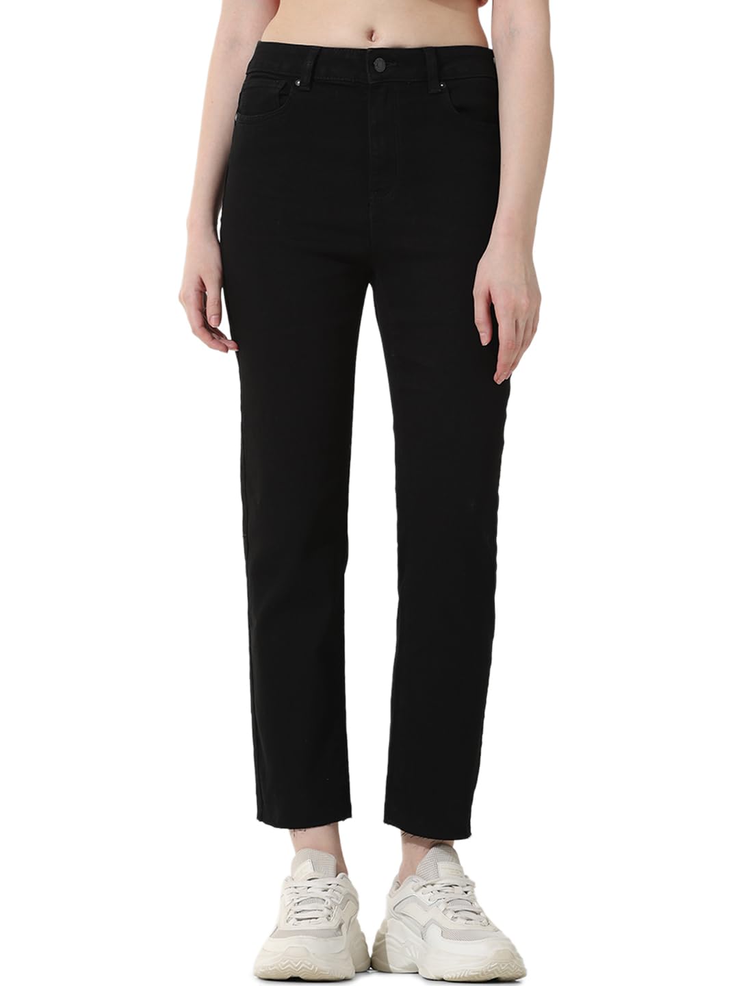 Straight fit clean look 5-pocket jeans in cotton denim with a high waist, button fly and straight legs with raw edge hem.