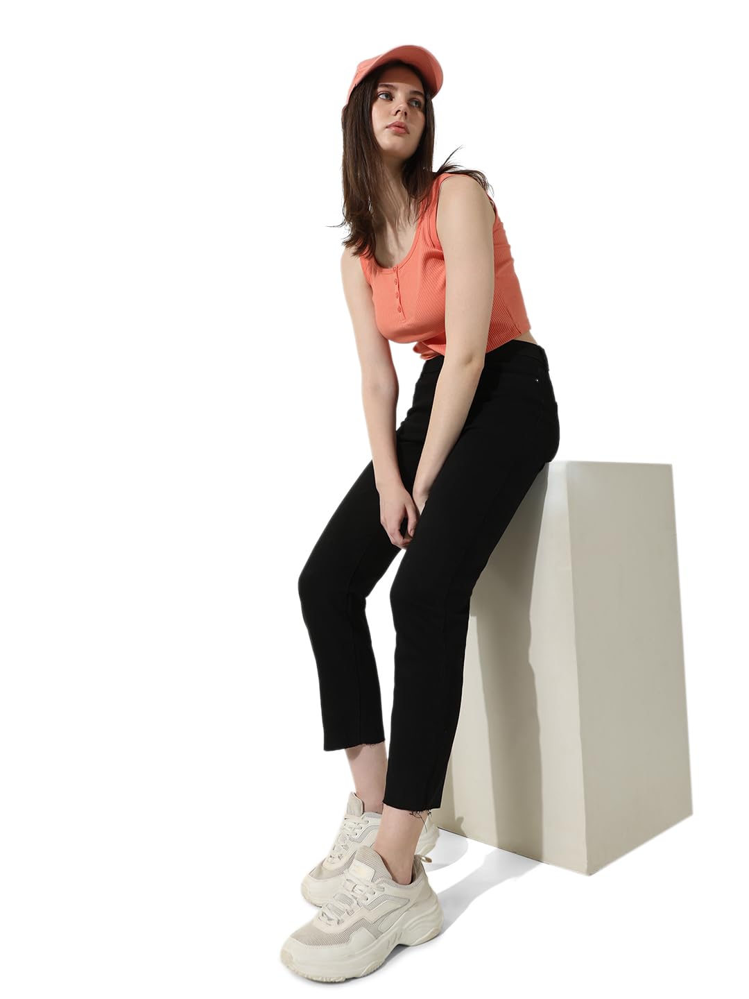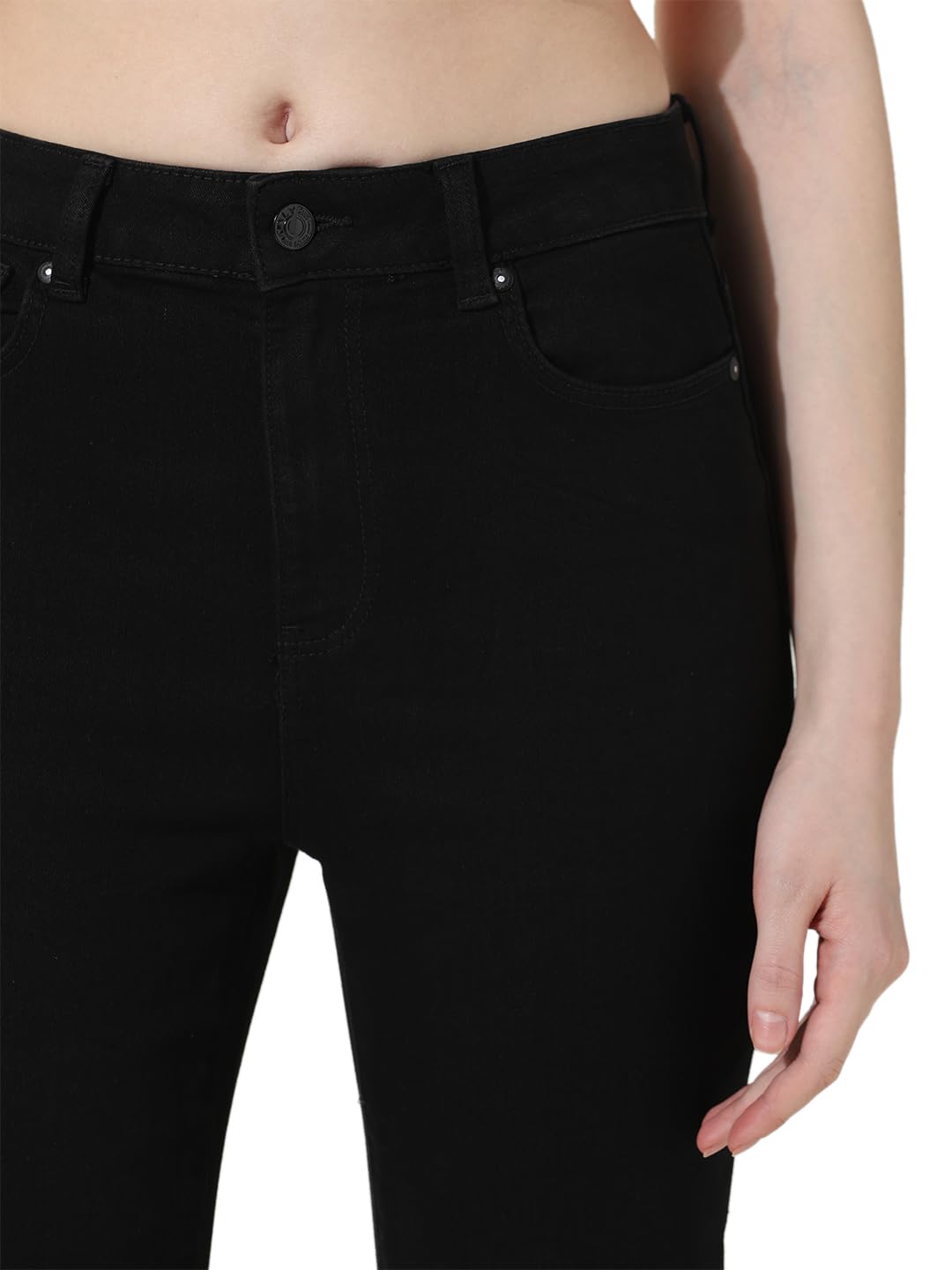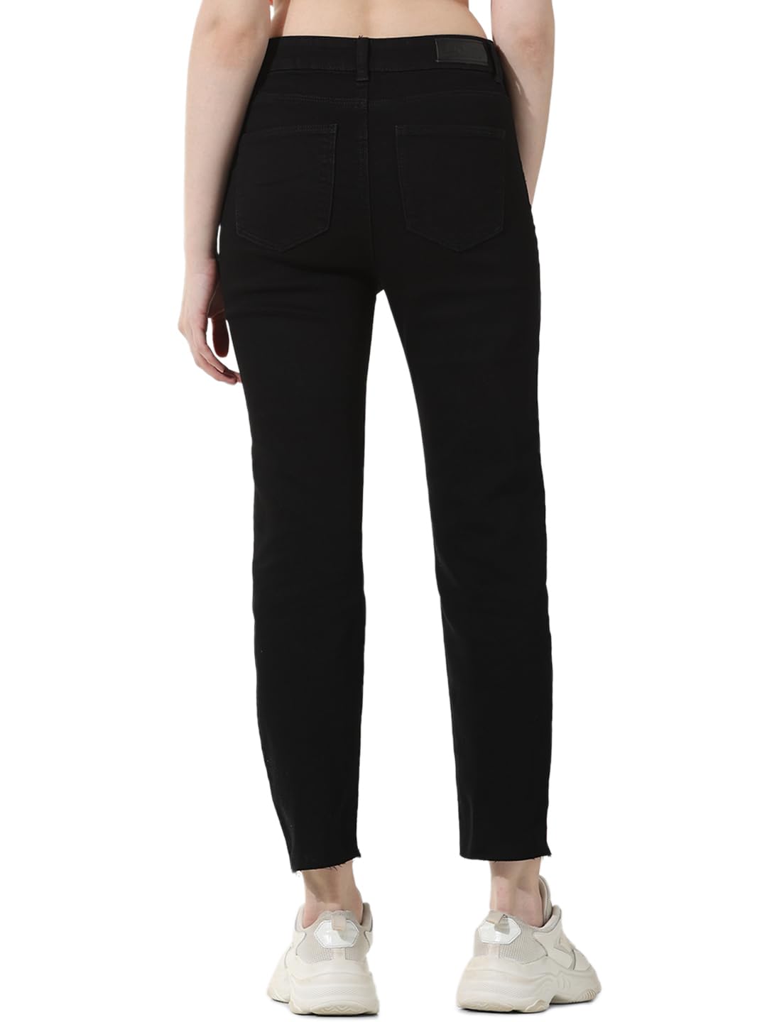 Straight fit clean look 5-pocket jeans in cotton denim with a high waist, button fly and straight legs with raw edge hem.