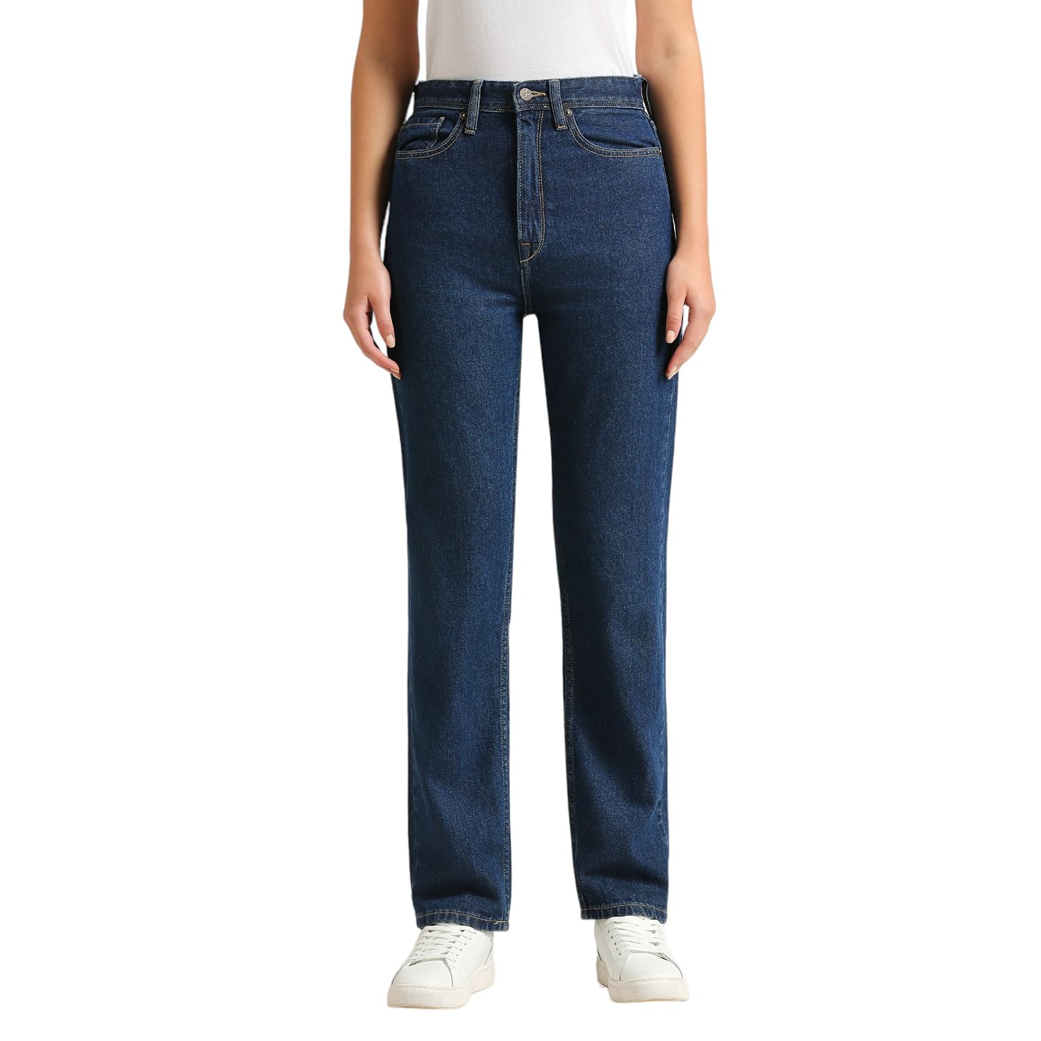 Trendy High Rise -Straight Fit Jeans, In A Classic Medium Blue Non-Stretch Rigid Denim Fabric With A Clean Look.