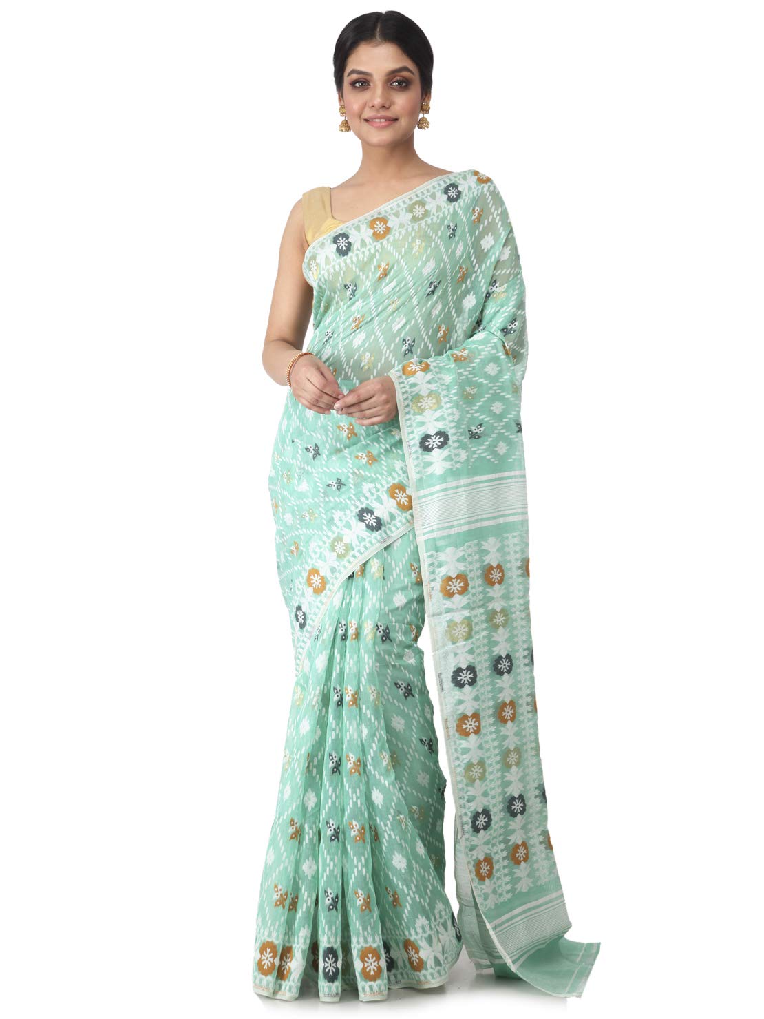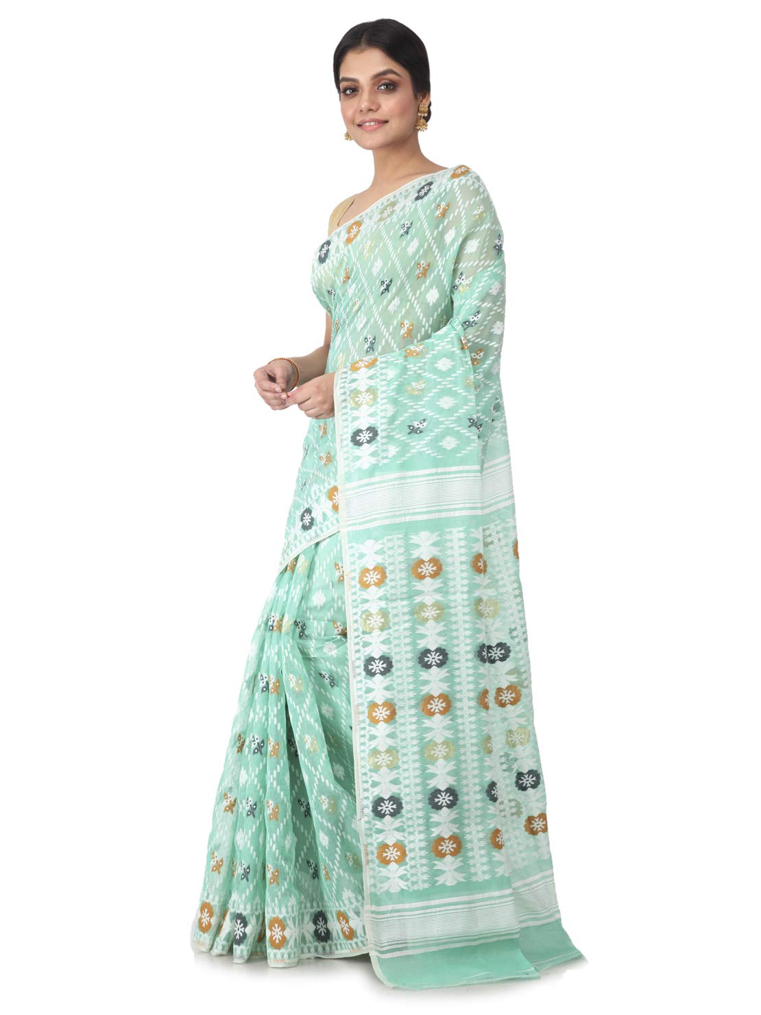 - Authentic Handwoven Jamdani Saree – Crafted by skilled weavers of Bengal, this saree showcases traditional Jamdani weaving with intricate floral and geometric motifs that reflect India’s rich textile heritage.