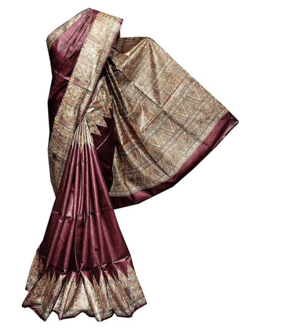 This beautiful madhubani pure ghicha tussar silk saree in brown shade is from the weavers of Bhagalpur in Bihar. This saree maintains the raw colour of the silk and has plain in brown all over the body. The pallu and the border of the saree is completely covered with intricate madhubani design in multicolor. The blouse piece is plain textured ghicha silk in brown.and made by 100% organic silk. This eye-catching saree is a perfect ensemble to mark any special occasion/conference in your office. This saree is also a perfect drape for any social gathering. Depending on the occasion you can choose between simple pearl or oxidized silver jewelry to accessorize this saree.