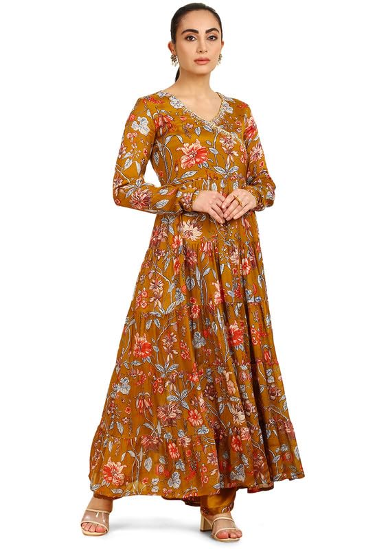 Soch Womens Maroon Chinon Botanical Print Suit Set With Faux Mirror And Sequins