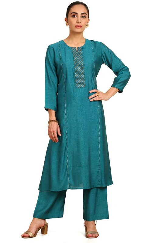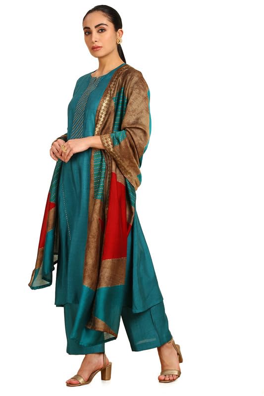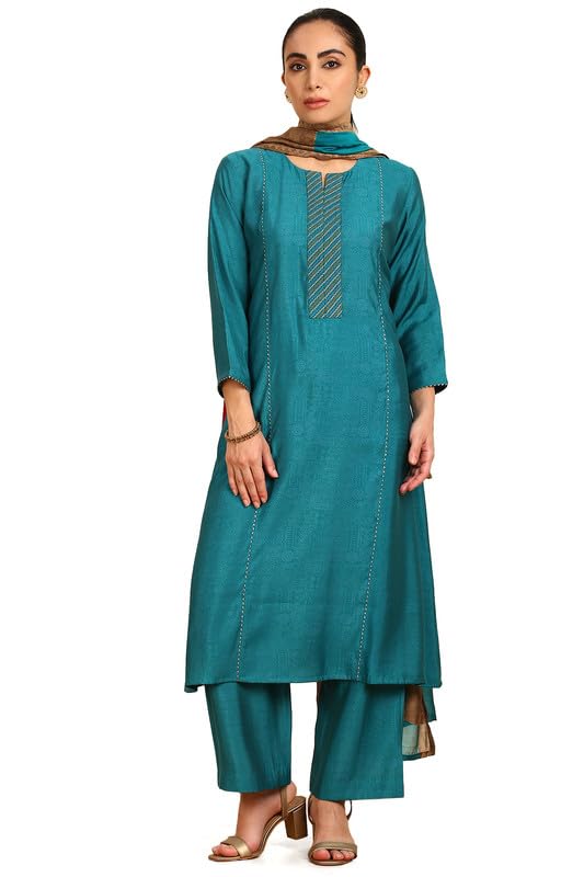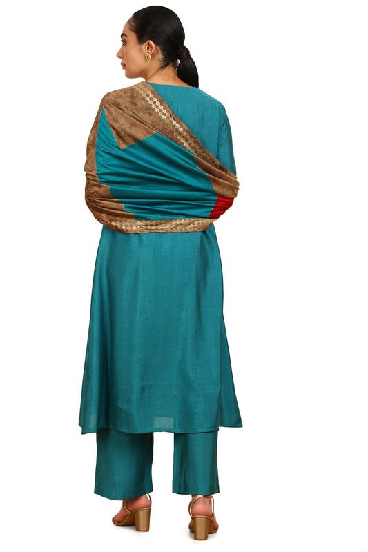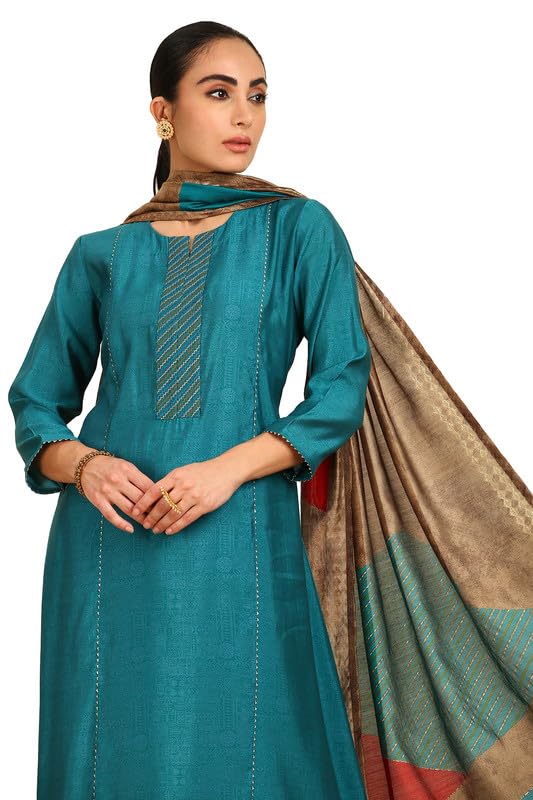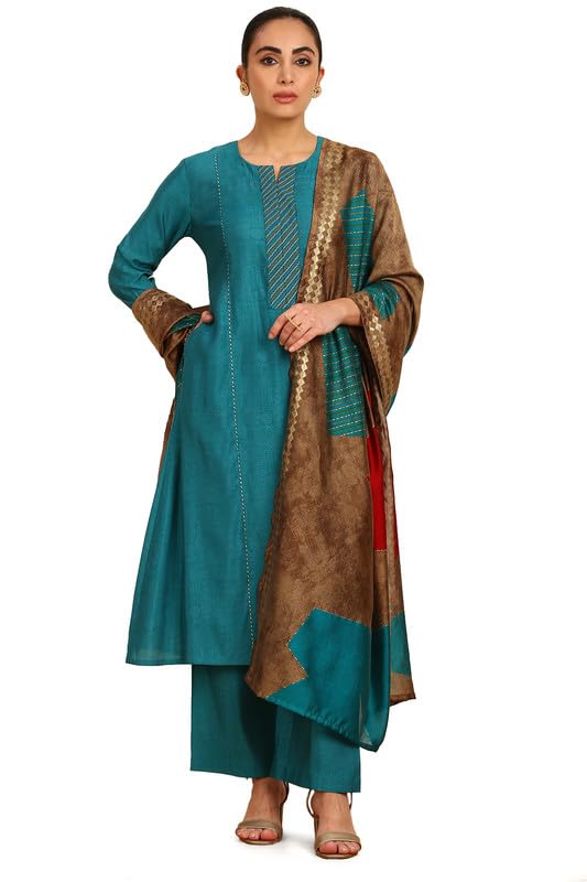 Soch Womens Teal Ethnic Print Notched Neck Muslin Blend Suit Set