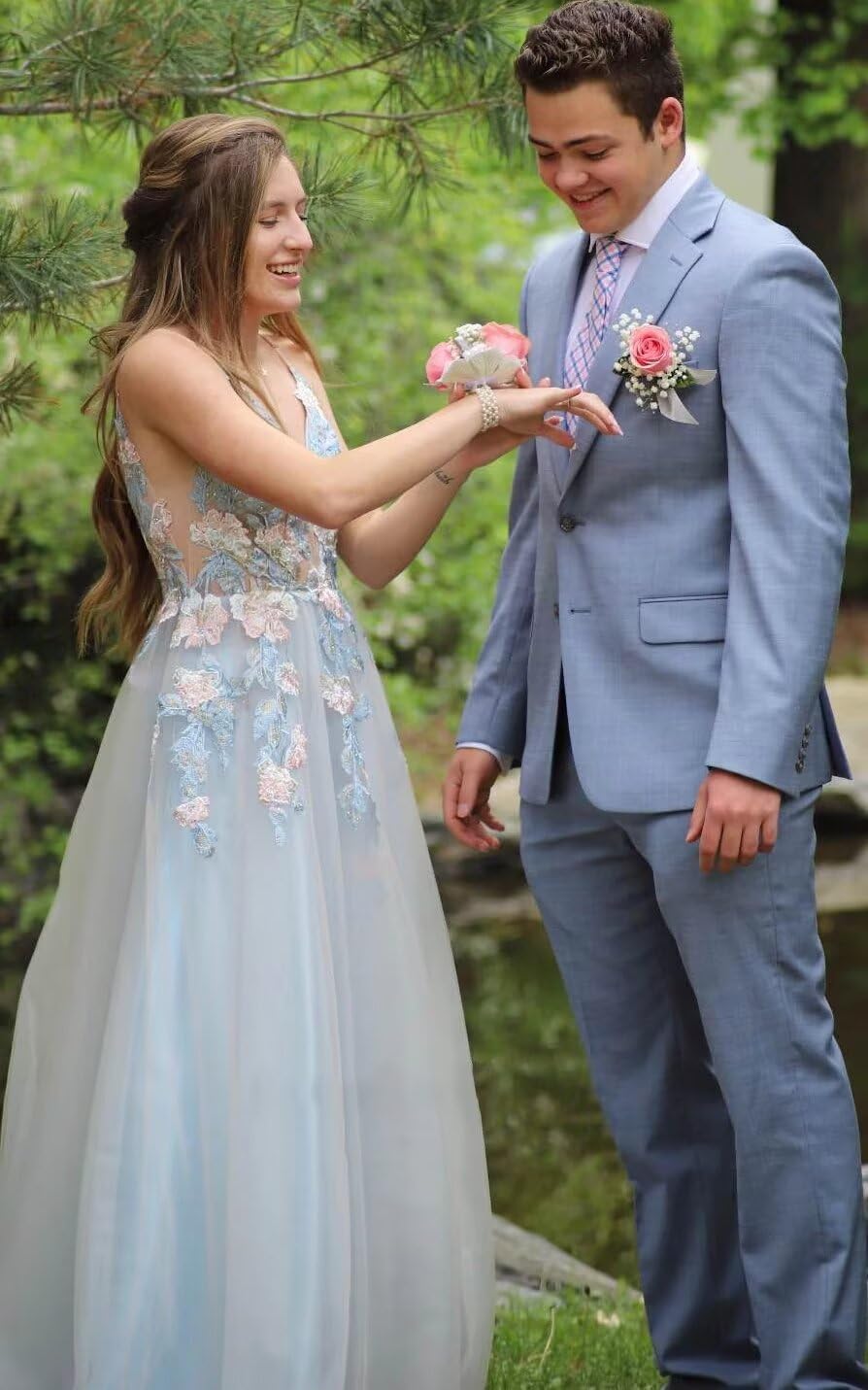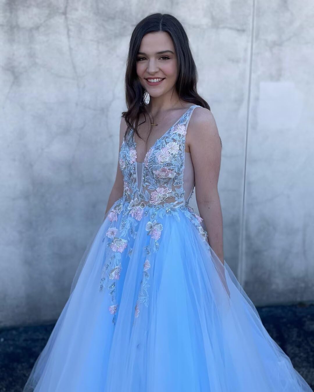 • ✨FEATURES:This lace v neck prom dresses made of skin-friendly tulle,The weight of the prom dress is about 1.3kg,3d flower,a-line,double v neck,floor length,lace up back,built-in bra.