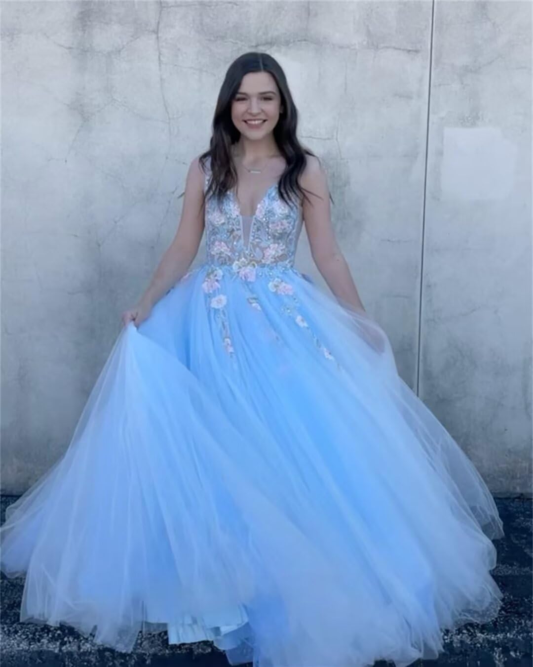 wayfor Women’s V Neck Tulle Prom Dresses 2024 Lace Ball Gown Long Applique Wedding Gown, Sky Blue, 14