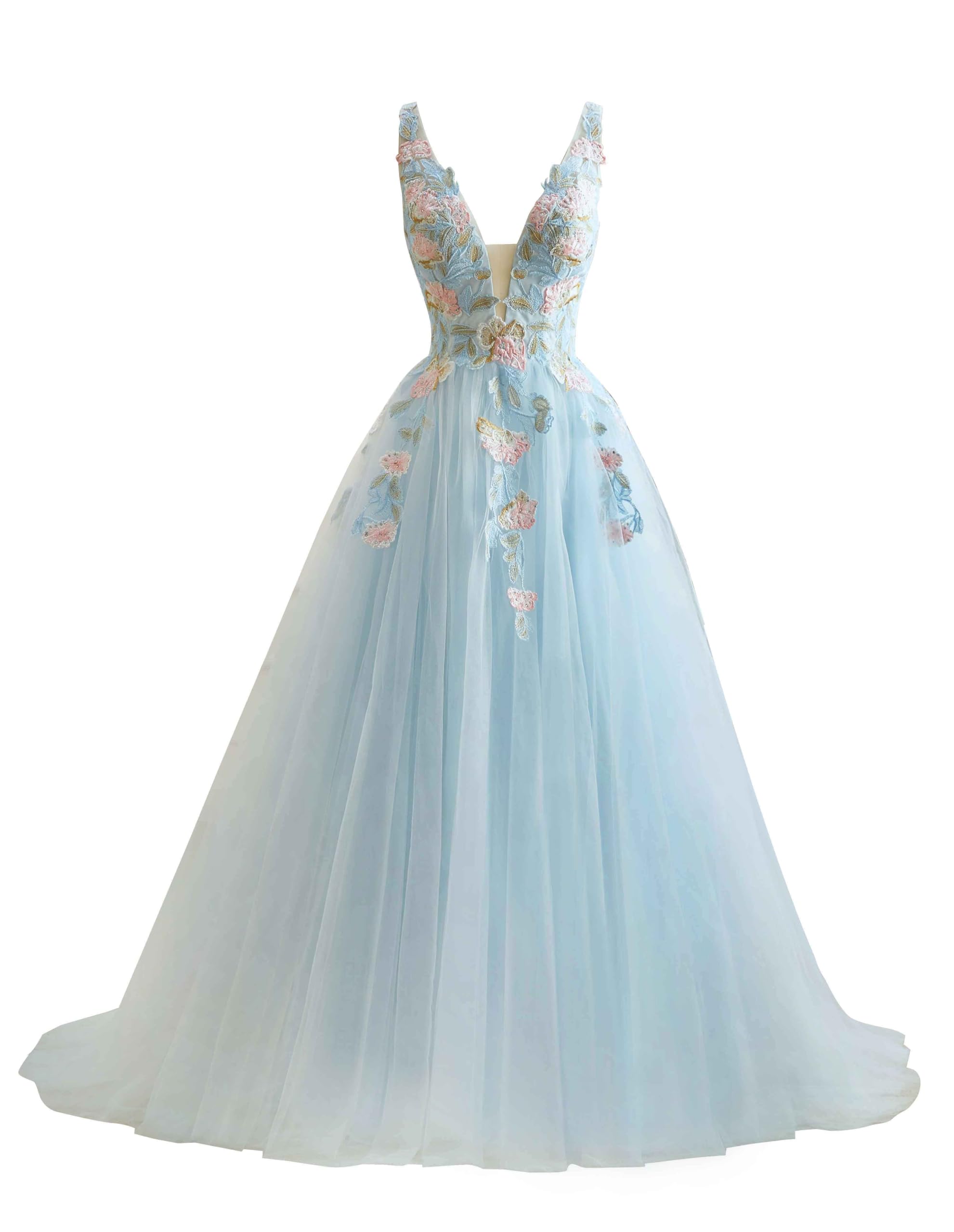 wayfor Women's V Neck Tulle Prom Dresses 2024 Lace Ball Gown Long Applique Wedding Gown, Sky Blue, 14