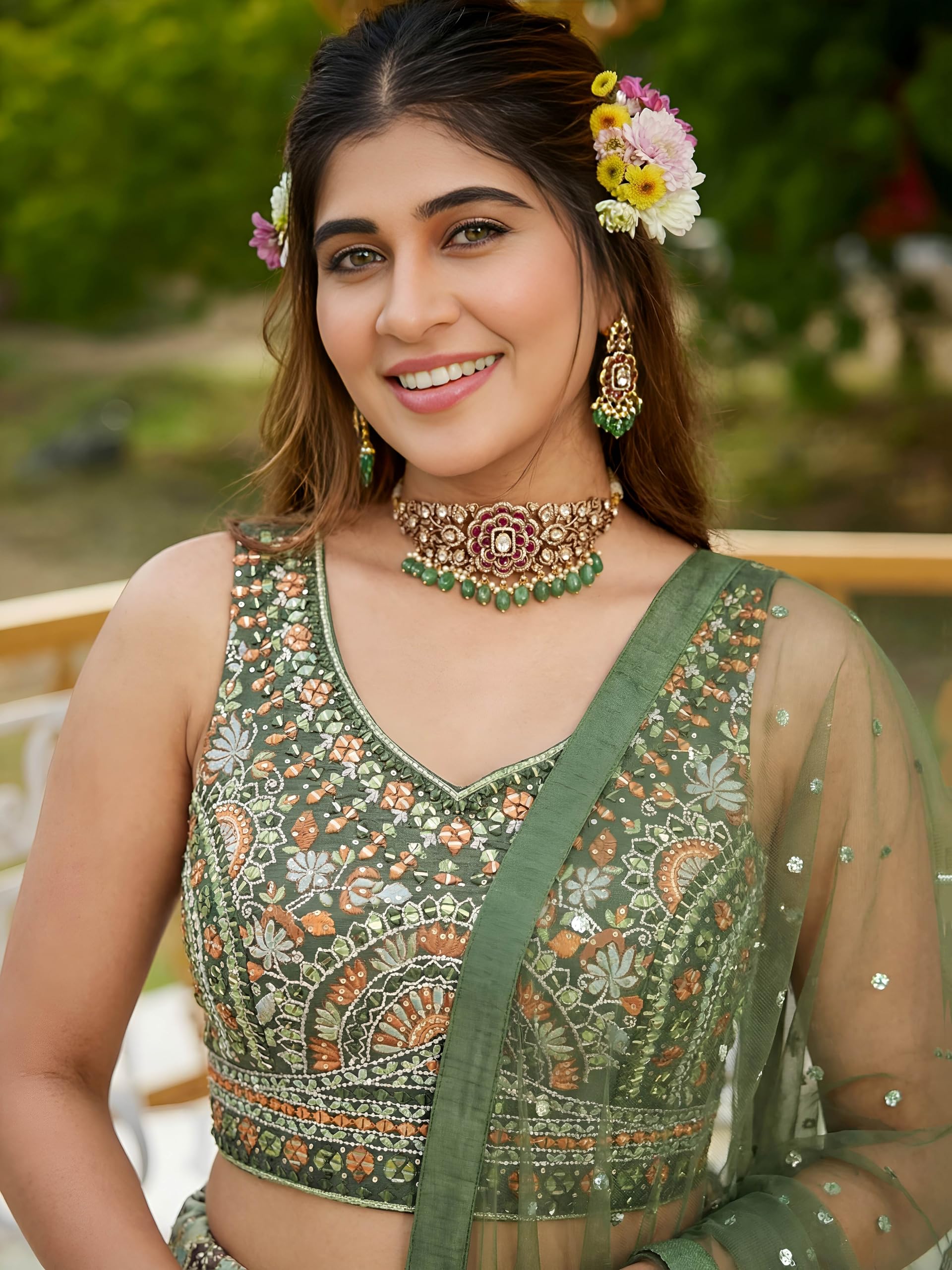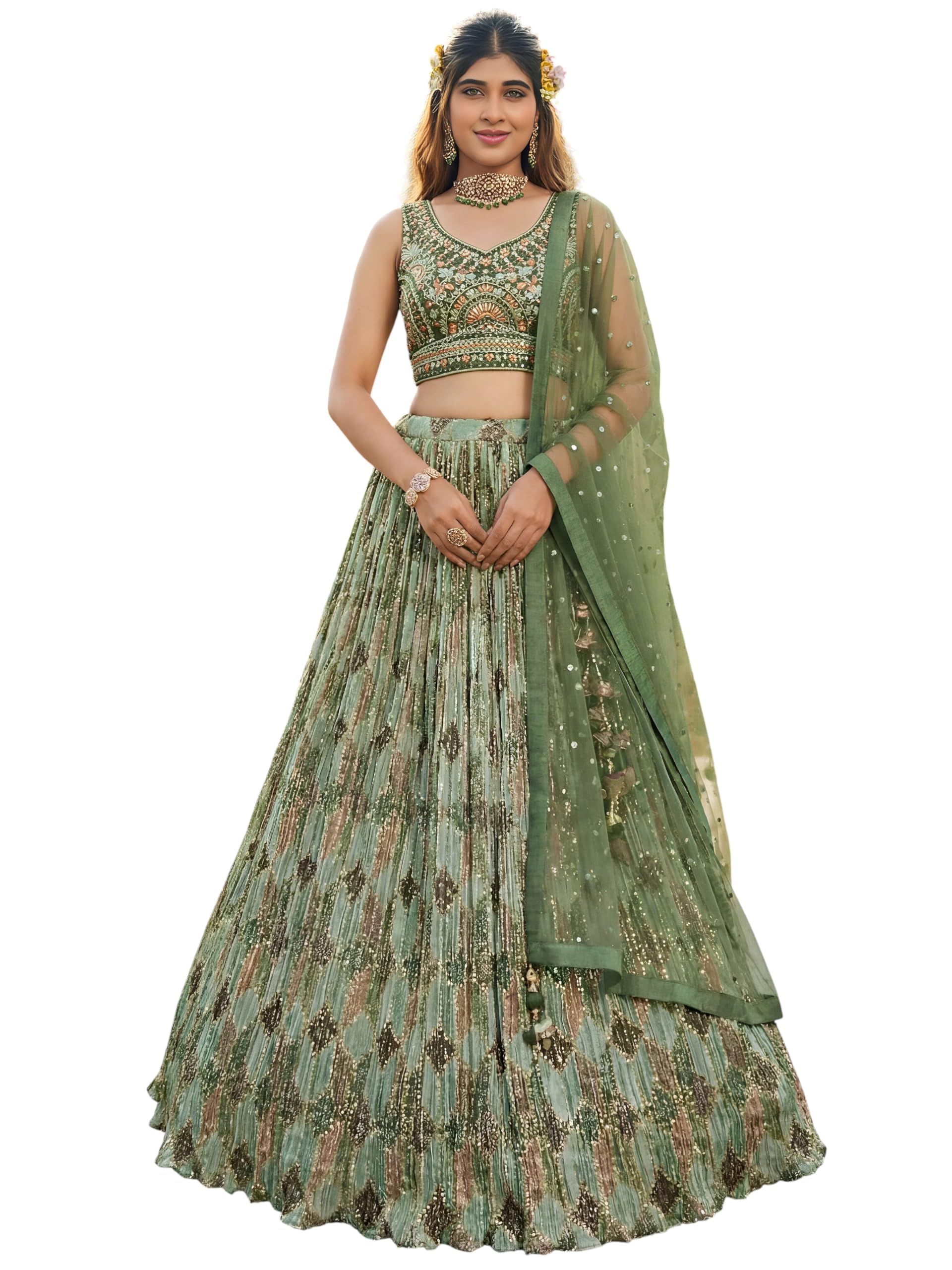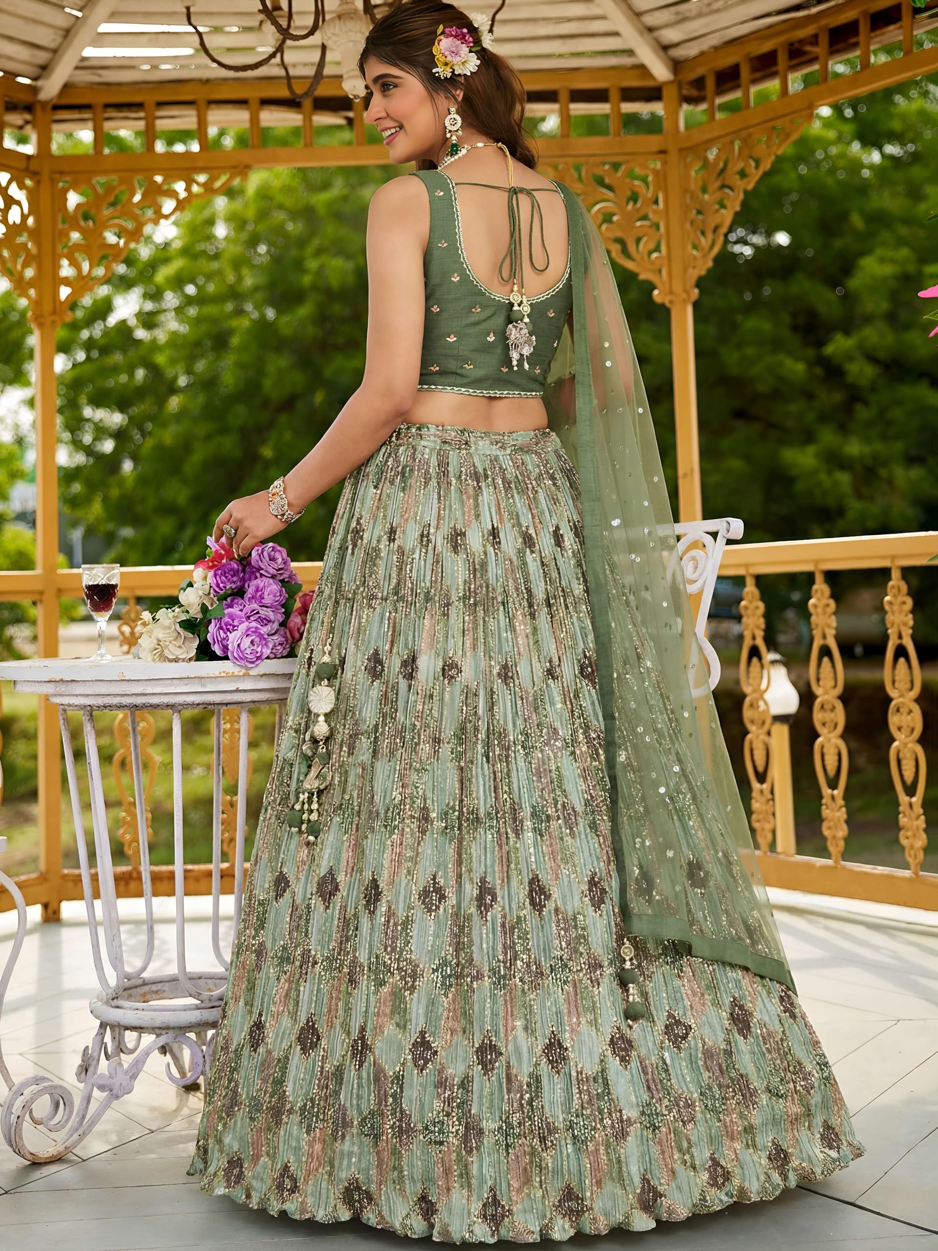 - Measurements: Lehenga(Semi-Stitched) Flair : 3.50mtr, waist-43″, height-43″; Blouse(Unstitched) Size: up to 44″; Dupatta Length: 2.25 mtr