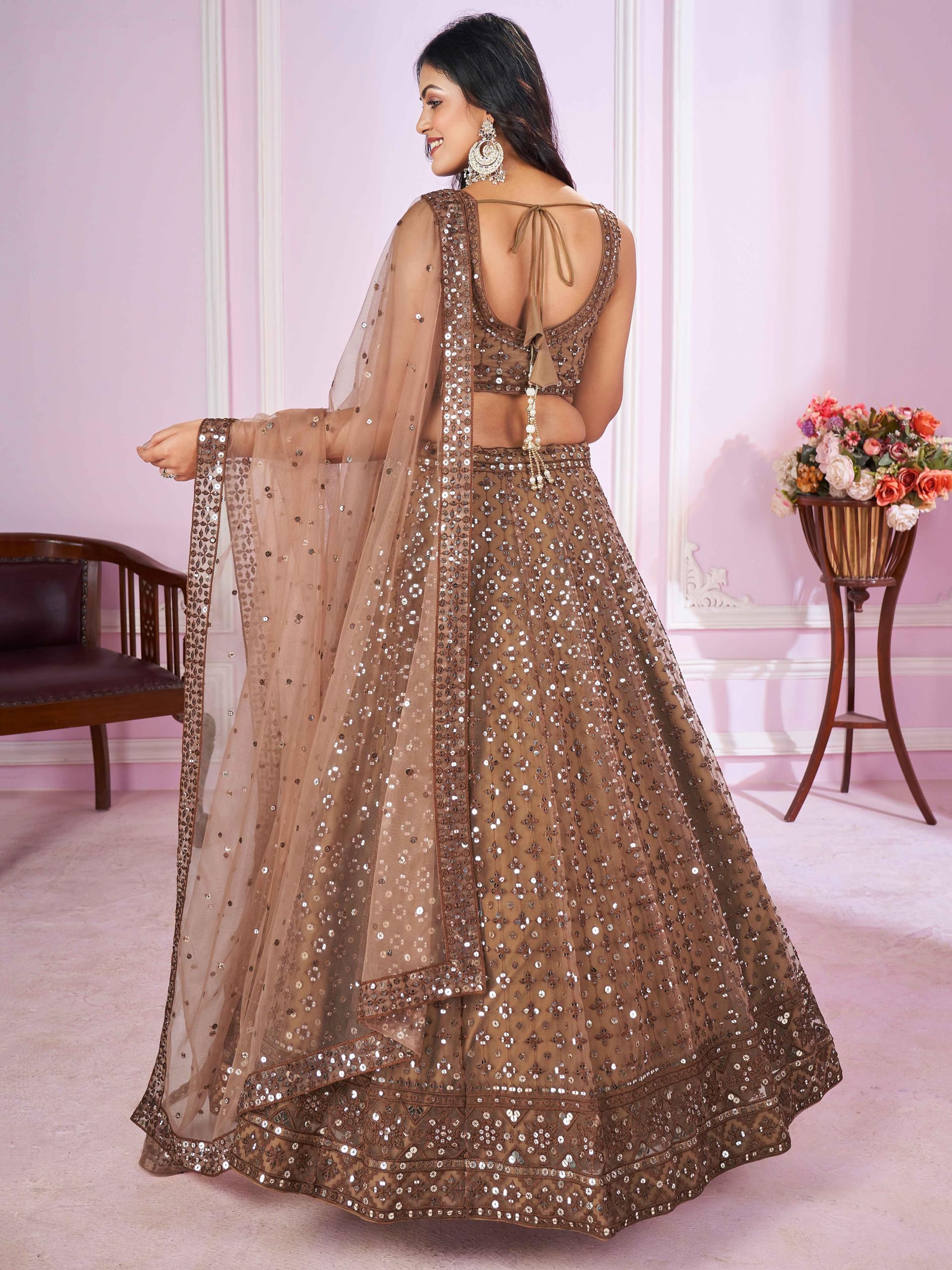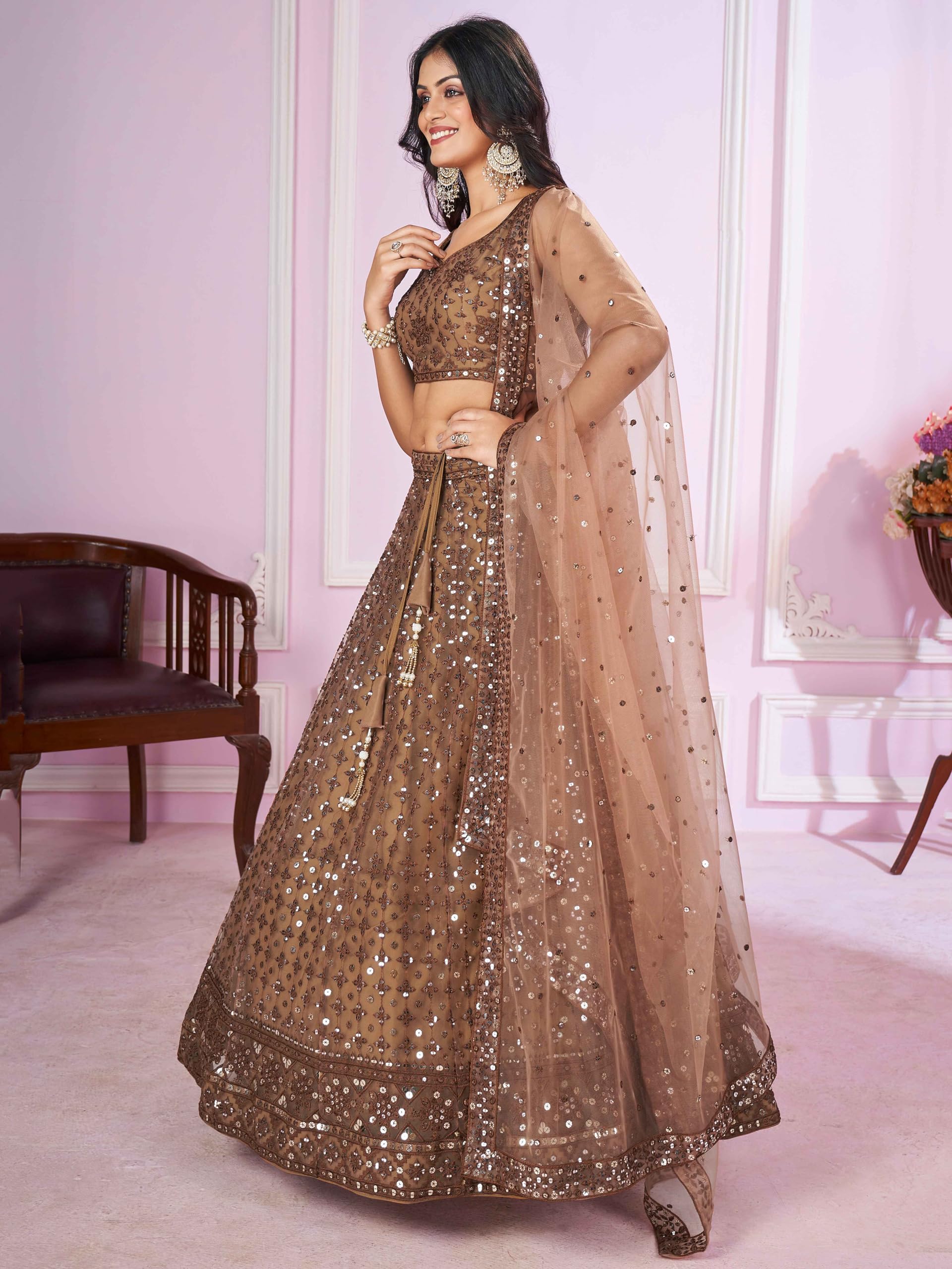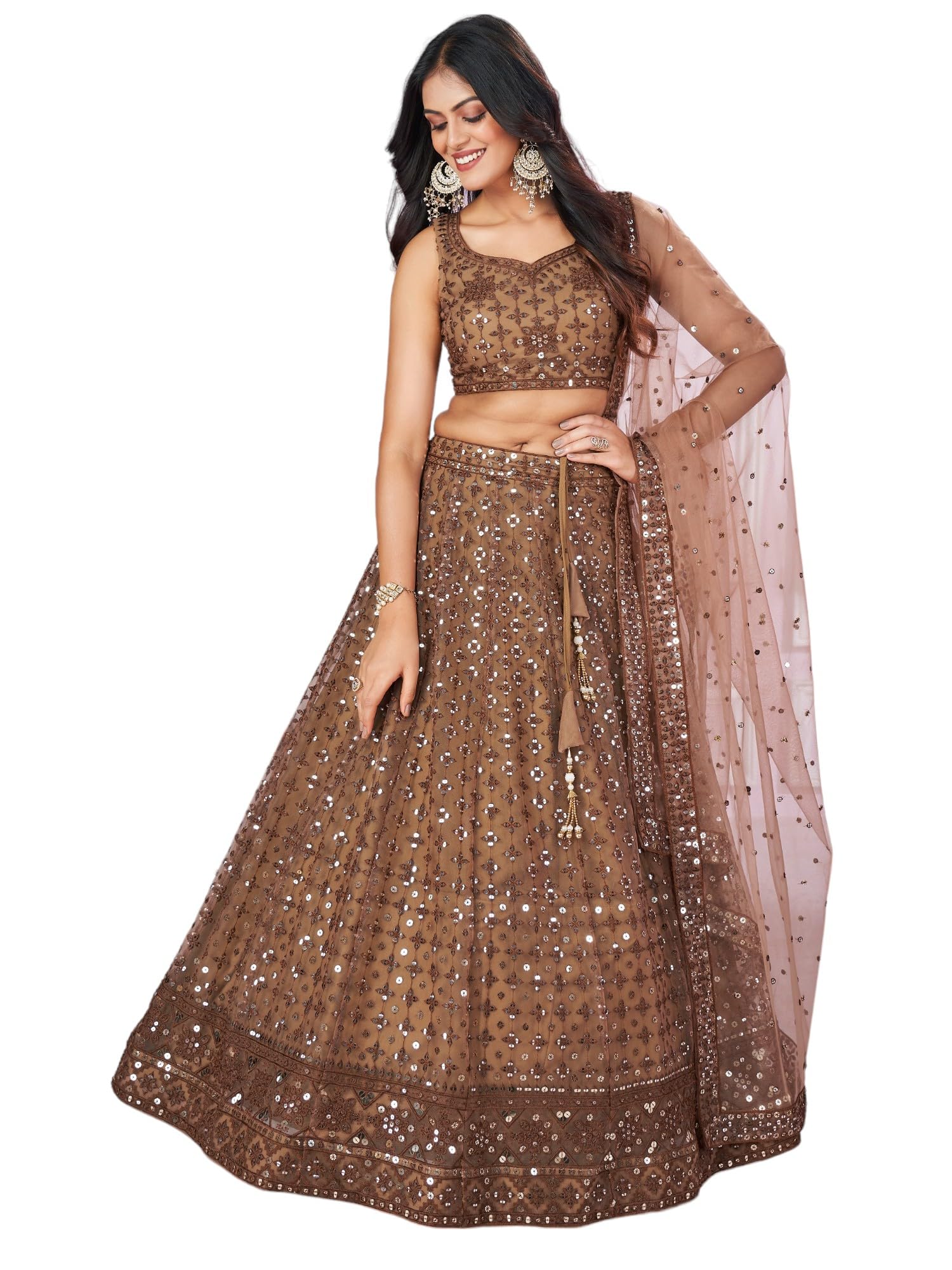 Zeel Clothing Women's Threads Sequins Embroidered Soft Net Semi-stitched Lehenga Choli Set With Dupatta (5110-Brown-Wedding-Stylish-Lehenga-Choli-Latest; Free Size)