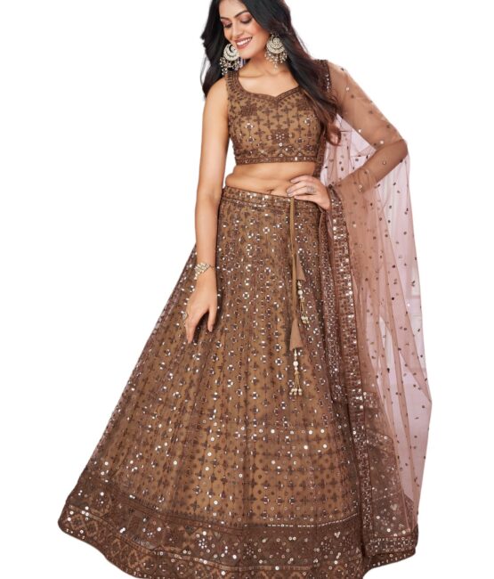 Zeel Clothing Women’s Threads Sequins Embroidered Soft Net Semi-stitched Lehenga Choli Set With Dupatta (5110-Brown-Wedding-Stylish-Lehenga-Choli-Latest; Free Size)